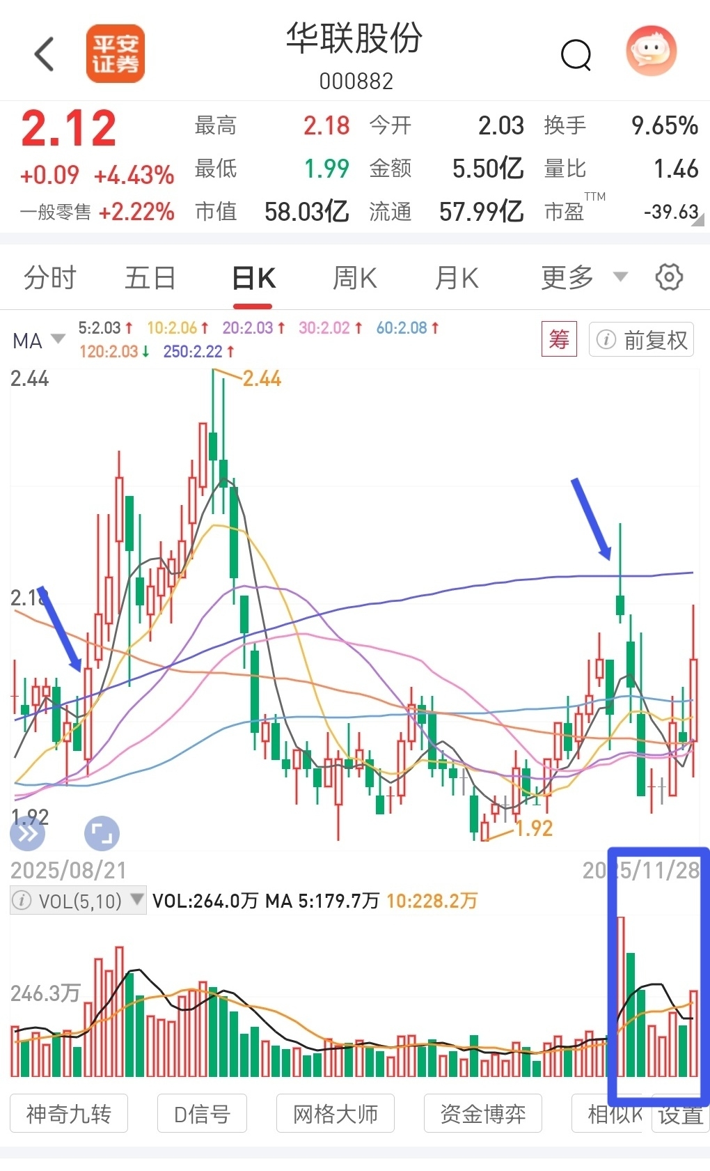 这票其实很简单:上次上了年线,走了一波上升,创高点2.44元。上次涨停板上年线,被砸,没站上年线。这两周换手率83%,实际流通盘换手率近100%,所以量能有了,如果这几天还站不上年线,就是过度放量,这票就废了。如果大阳线强势上年线,振荡几天,就会展开主升浪。结论:年线上持股,不做空。