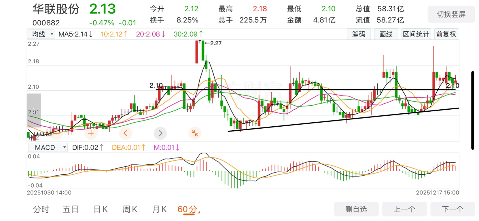 $华联股份(SZ000882)$ 再看一天,应该在这继续盘,够呛能下来,踏马的,第二笔要不是卖点成买,这半仓今天也出了。