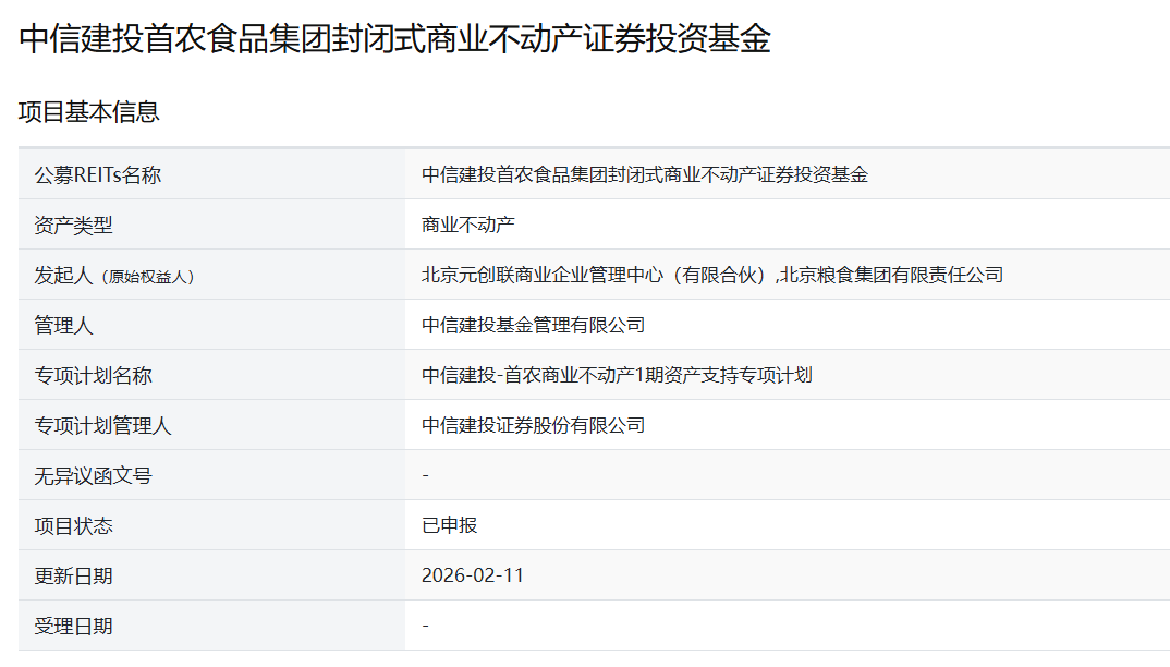 上证报中国证券网讯(记者聂林浩)据上交所2月11日披露信息,中信建投首农食品集团封闭式商业不动产证券投资基金已正式申报,这是国内第12单正式申报的商业不动产REITs,也是上交所的第11单。
