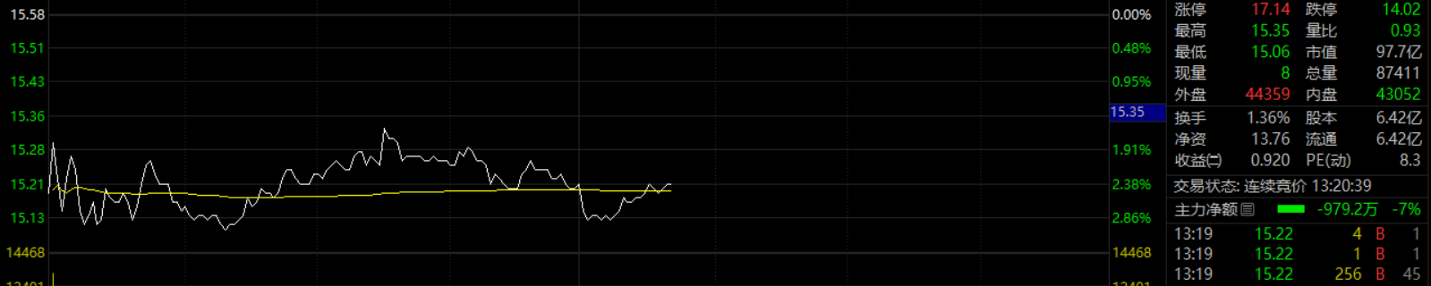 城发环境主力今天真是亏了,花了上千万元反复砸盘到15.20附近却砸下不去,只得在15.25元以上至收盘多花3百万元买回去。