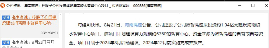 海南高速:控股子公司投资建设海南陵水智算中心项目。