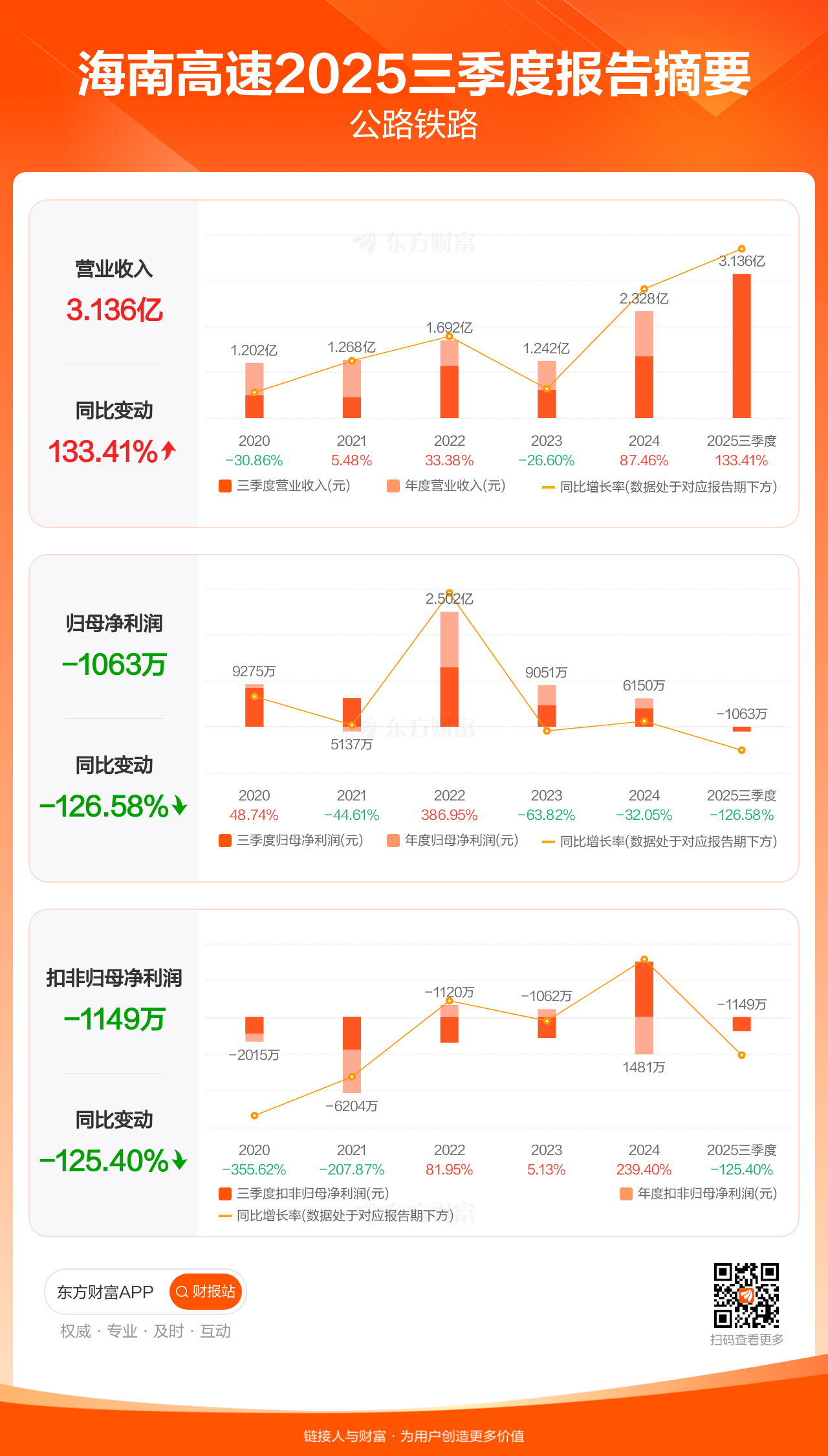 海南高速10月29日发布2025年三季报显示,公司前三季实现营业收入3.14亿元,同比增长133.41%;归母净利润-1062.99万元;扣非归母净利润-1149.23万元。