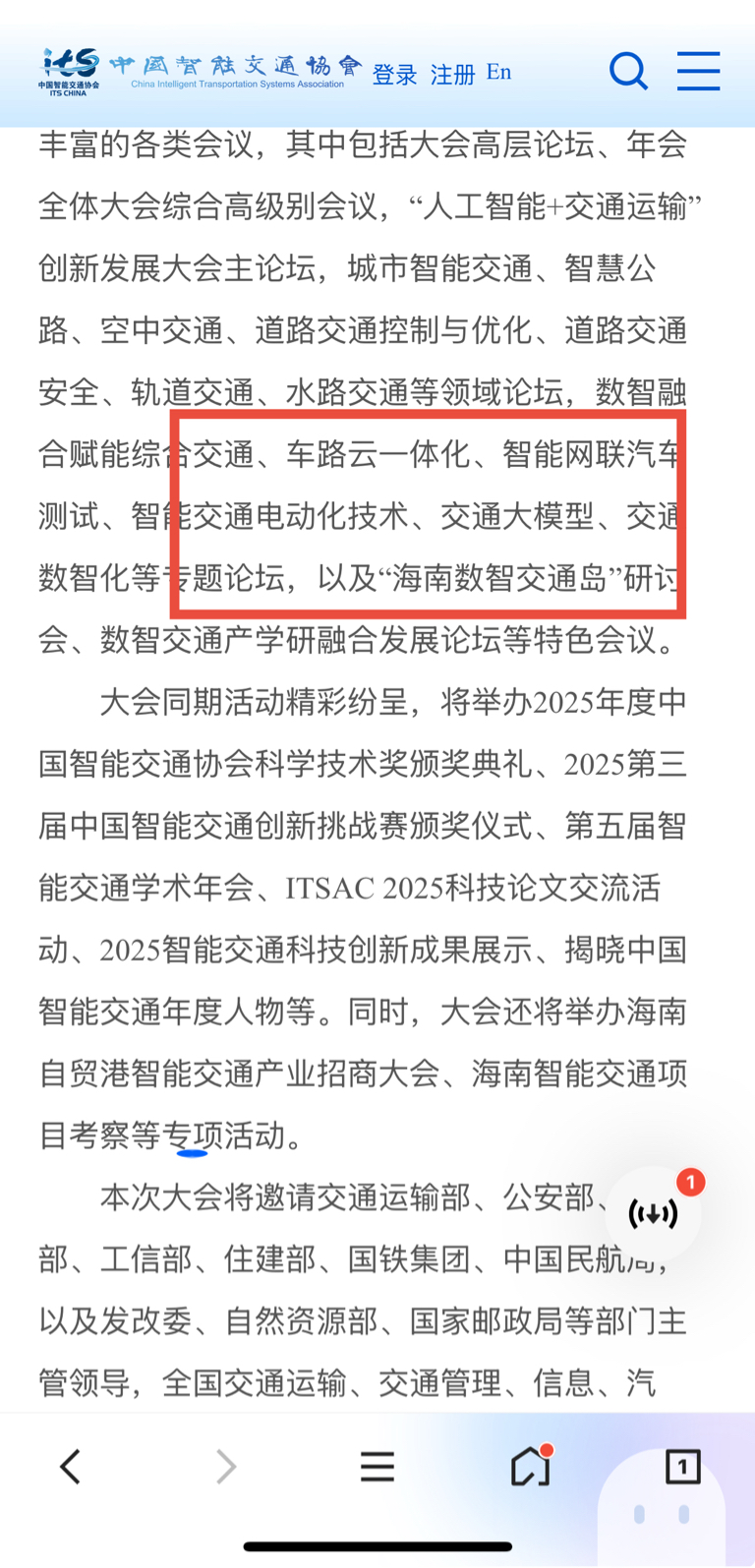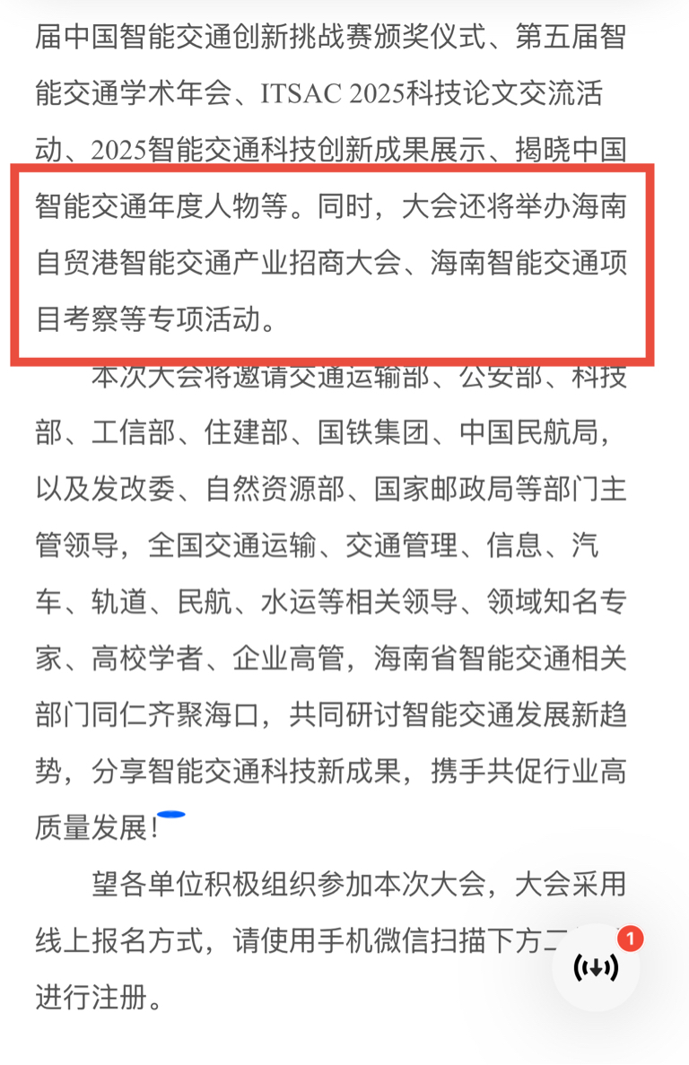 $海南高速(SZ000886)$ 海南举办中国智能交通大会是19日,海南高速控股股东海南交通集团承办。会议有海南车路云一体化、交通大模型以及“海南数智交通岛”、海南自贸港智能交通产业招商大会、海南智能交通项目考察等。