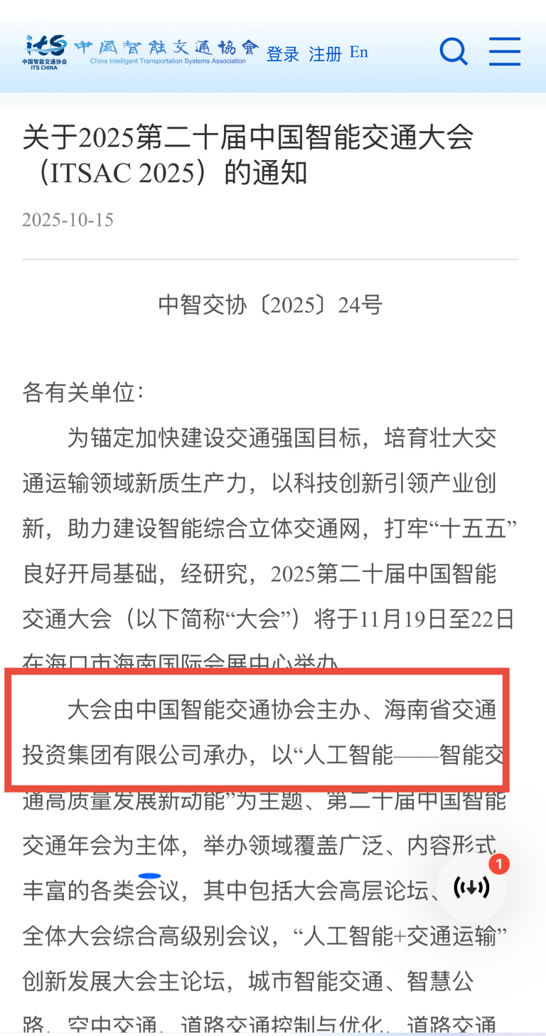 海南举办中国智能交通大会是19日,海南高速控股股东海南交通集团承办。会议有海南车