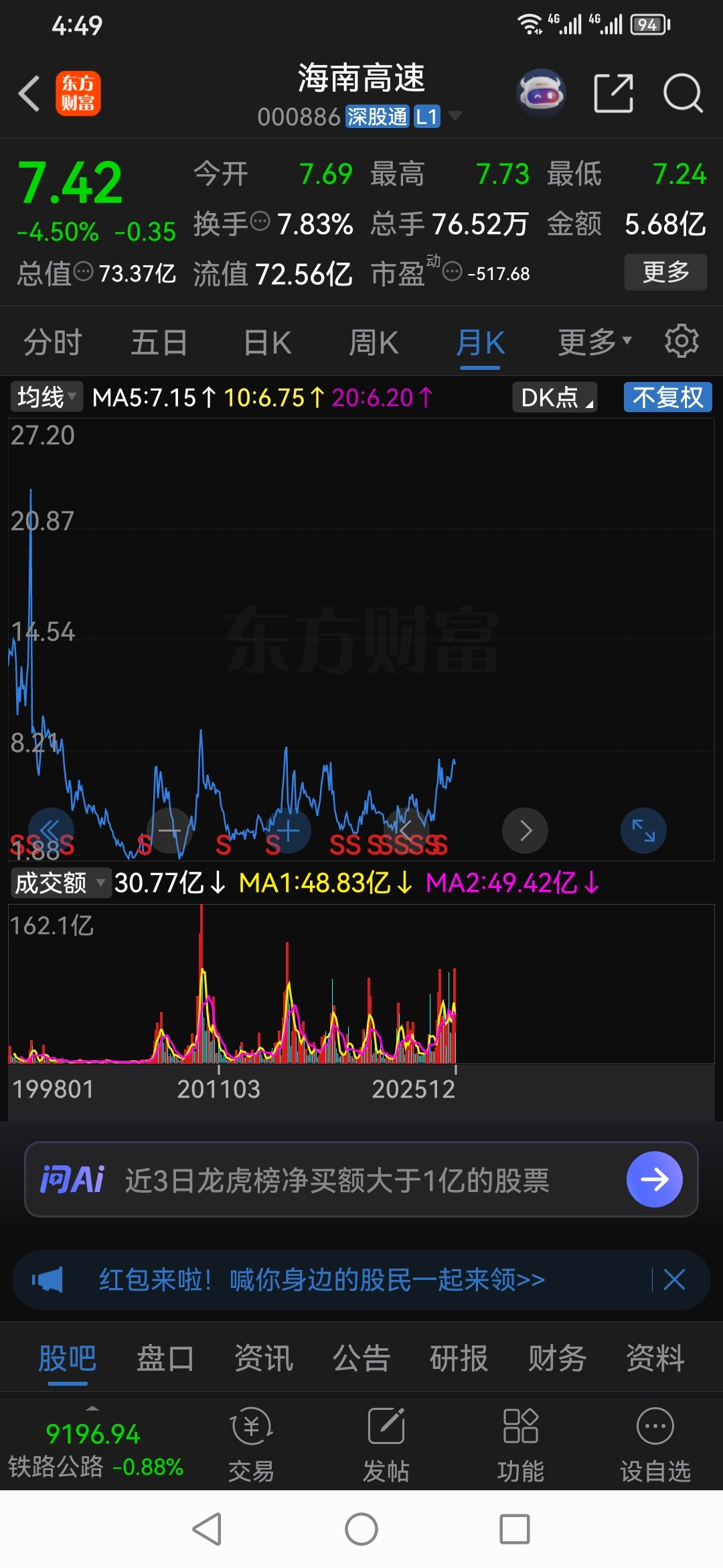 $海南高速(SZ000886)$ 月线拉长了看此时不突破更待何时?