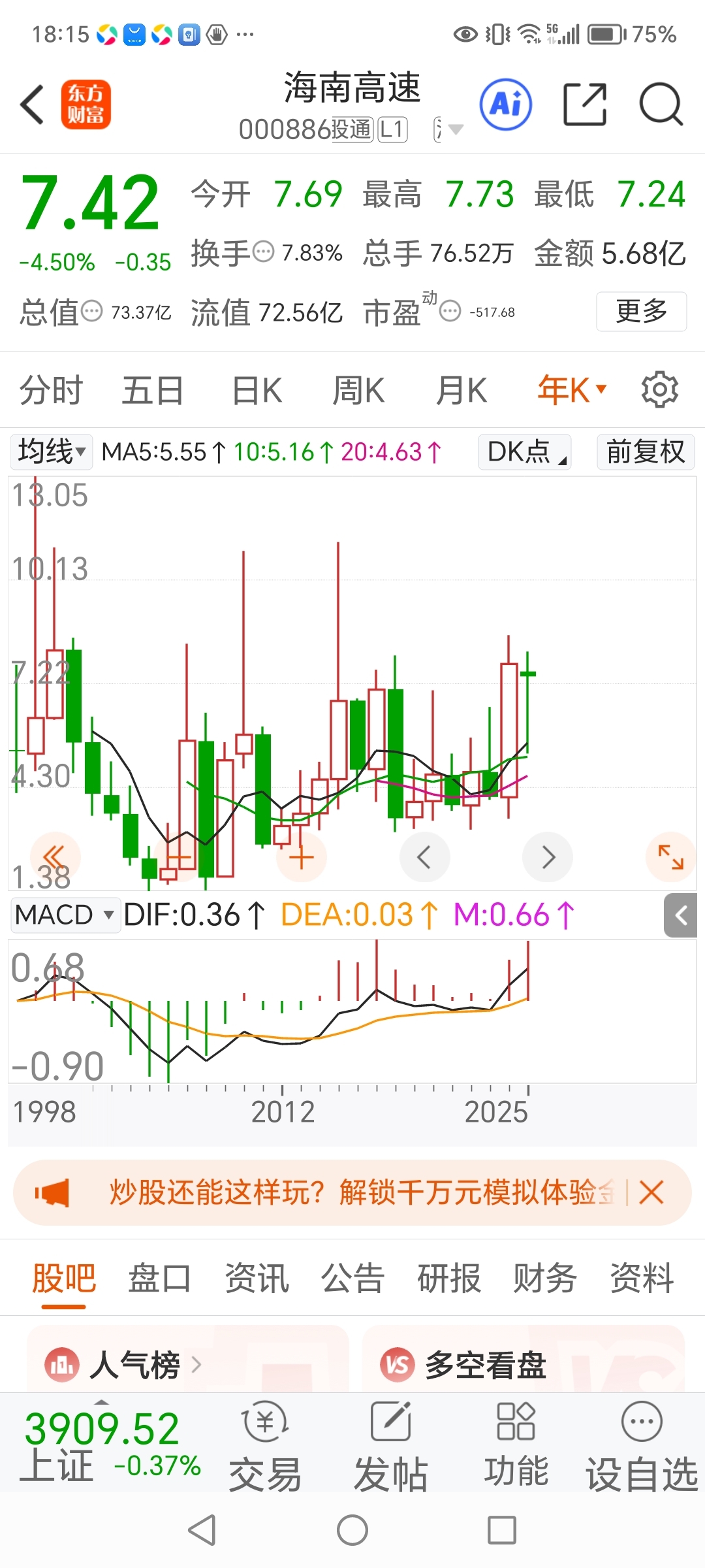 $海南高速(SZ000886)$ 现在股价7.42元低于 年k线开盘7.56元,低于去年高点,海南封关大利好年线收长阳可期,现在股价下跌空间极小上涨空间很大。