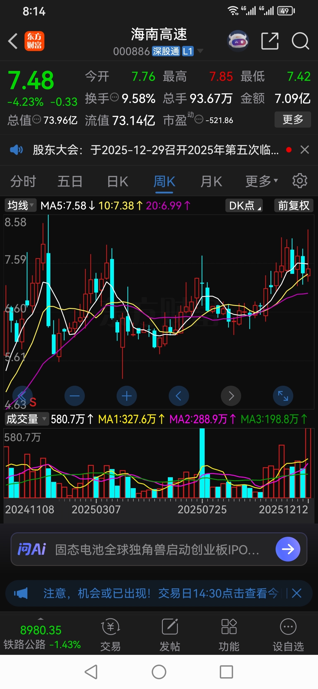 $海南高速(SZ000886)$ 这是海南高速一年的走势,到目前还在箱体里,还没突破,你说他在高位要向下?跟其他海南股走势一样么?你怎么不想想为什么一直不突破呢?有句话叫“吃饭不怕晚,晚饭是好饭”