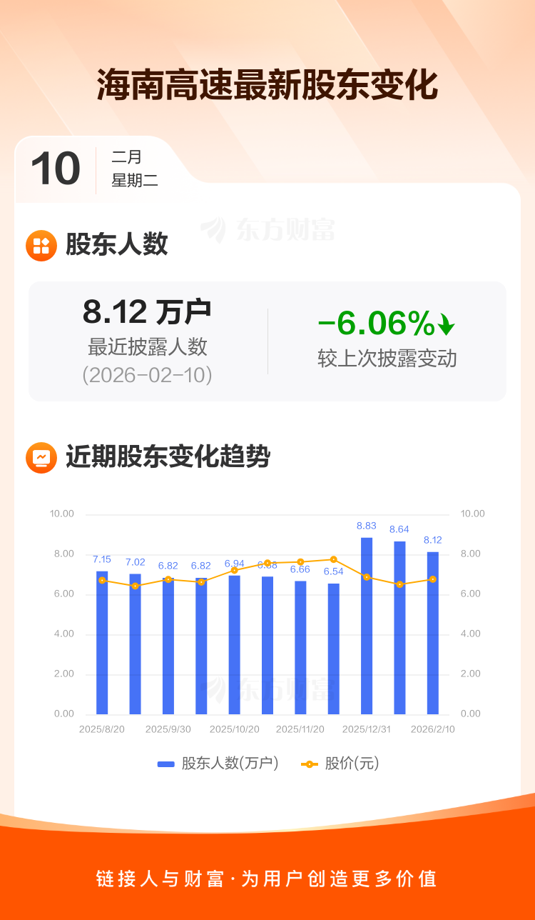 海南高速:截至2月10日最新股东户数8.12万户,较上期减少6.06%