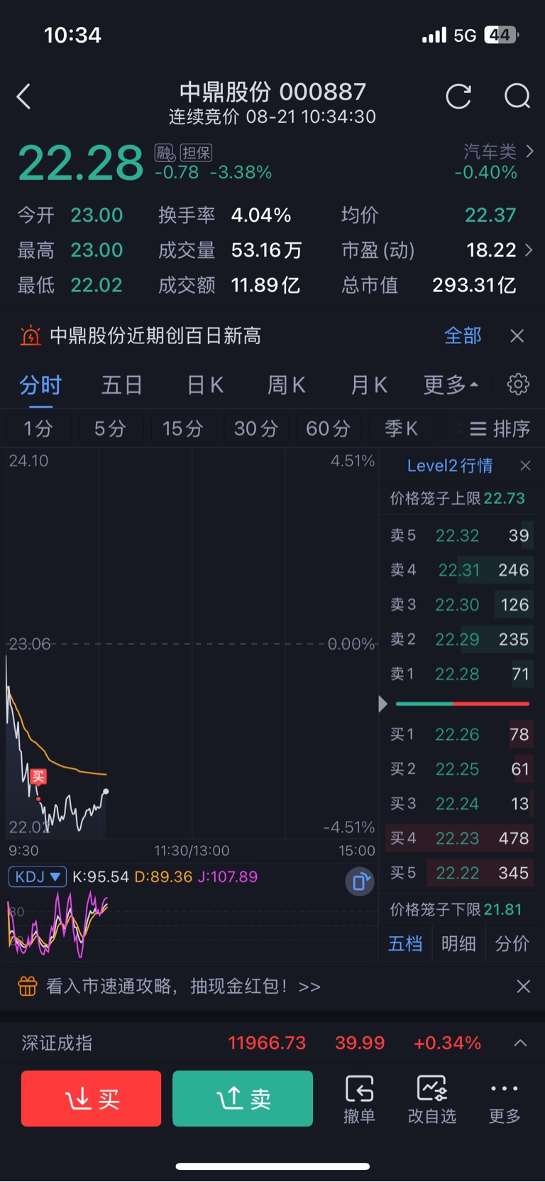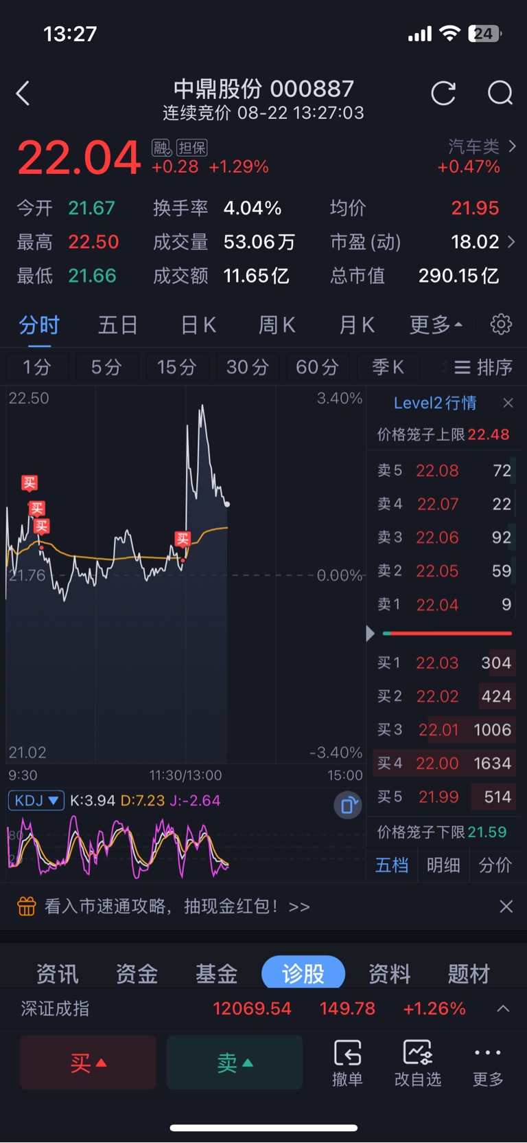 早盘小幅高开两个多点,对于昨天追涨的和打板客来讲不及预期,导致开盘就疯狂的抢跑兑现,盘中一路下挫至 20.9,跌穿了昨天的涨停分时均价线,吓走了不少人,伴随着成交量的放大,然后一波快速的拉升至三月份的平台中枢,因抛压太大没有选择直接突破而是退守至均价线 21.7,然后企稳,这个位置没有减仓的理由而是可以低吸的