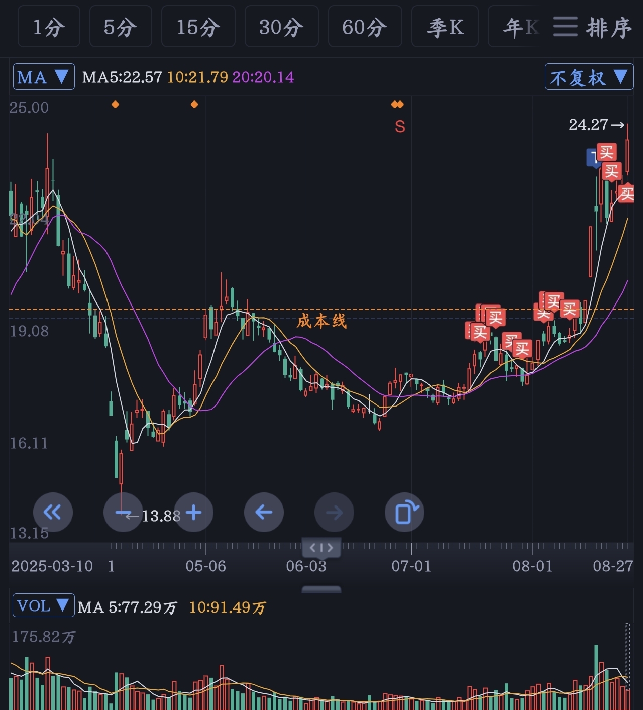 原本521手寓意我爱你,但8.27的仙人指路,我不得不为自己的认知做个锦上添花!接下来择机到600手吧,感谢主力!