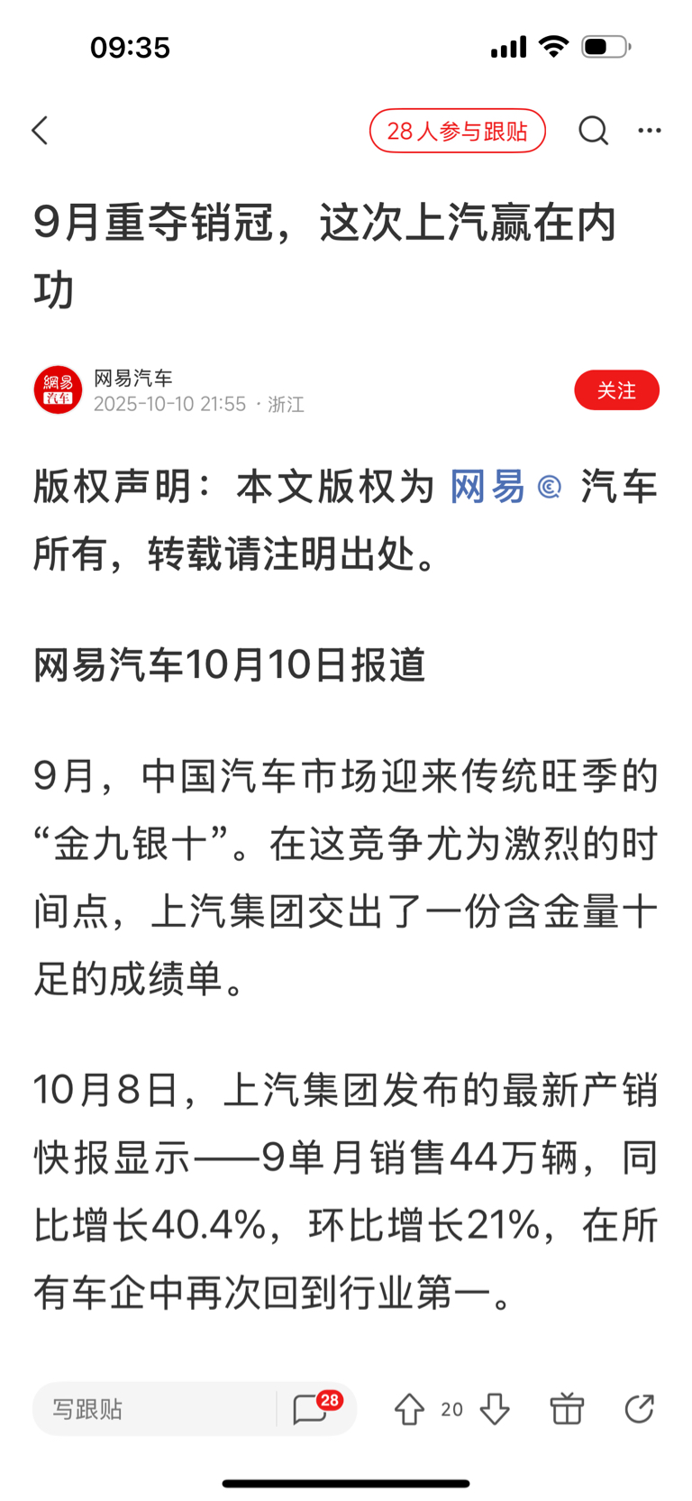【牛】中鼎最大的客户上汽集团发布的最新产销快报显示——9单月销售44万辆,同比增