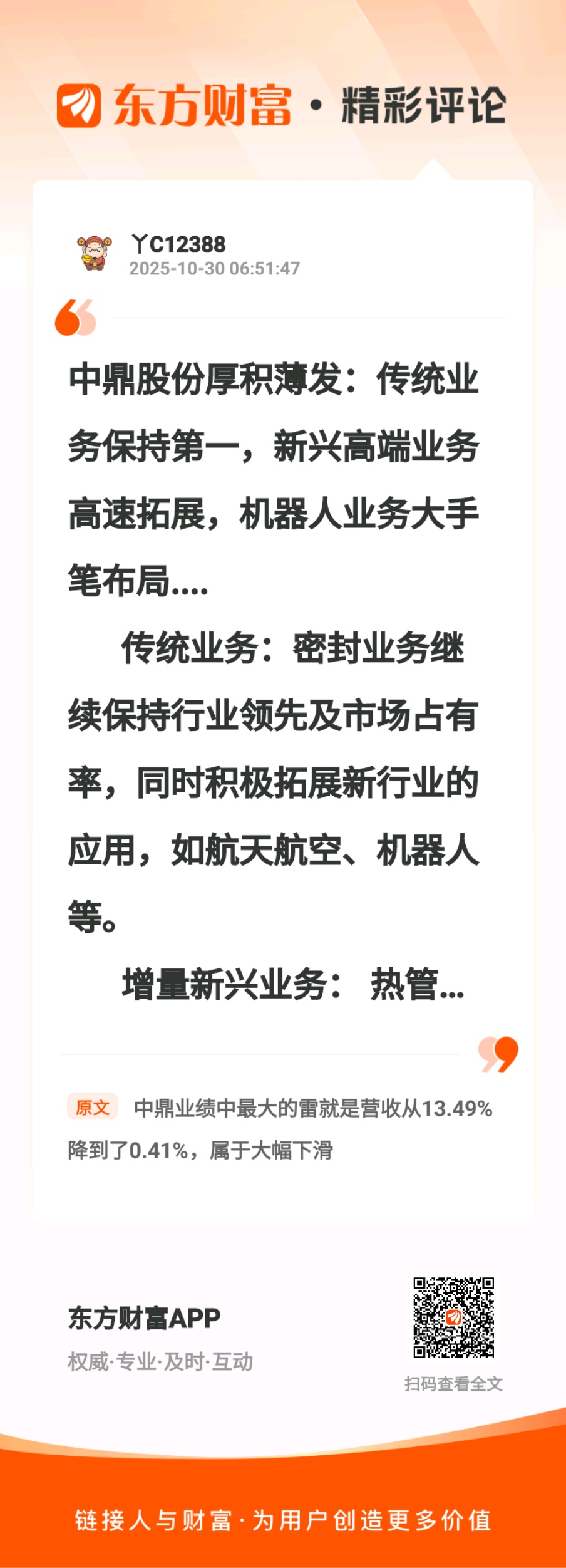 //@丫C12388 :中鼎股份厚积薄发:传统业务保持第一,新兴高端业务高速拓展,机器人业务大手笔布局.... 传统业务:密封业务继续保持行业领先及市场占有率,同时积极拓展新行业的应用,如航天航空、机器人等。 增量新兴业务: 热管理系统、底盘轻量化系统、空气悬挂系统等多个新能源板块处于国际领先水平,业务量处于加速阶段。其中热管理是新能源汽车电池热管理管路总成产品优秀供应商,拥有自主专利的独家生产技术creatube工艺以及TPV软管和尼龙管的核心技术,公司在所处细分领域行业全球排名前二。储能领域已推出系列化液冷机组,及浸没式液冷机组;超算中心热管理领域主要产品为CDU(冷液分配装置),未来根据实际需要,逐步将浸没式技术运用到超算中心热管理中,目前公司正在加速与客户对接。 人形机器人业务:关节总成、谐波减速器、行星减速器、力觉传感器等产品上完成产业布局,现在已经送样于各大机器人龙头企业,如:宇树科技、优必选、墨甲机器人等,正处于验证阶段,其中密封业务已经开始配套供货,最近又成立了人形机器人本体制造公司,完成了最全的人形机器人全产业链布局,力争发展成为我国机器人行业,从部件制造到本体制造,产业链最完整的龙头企业。