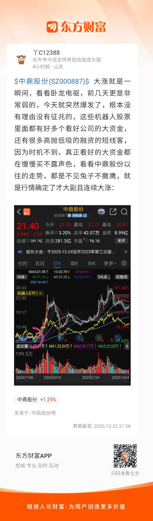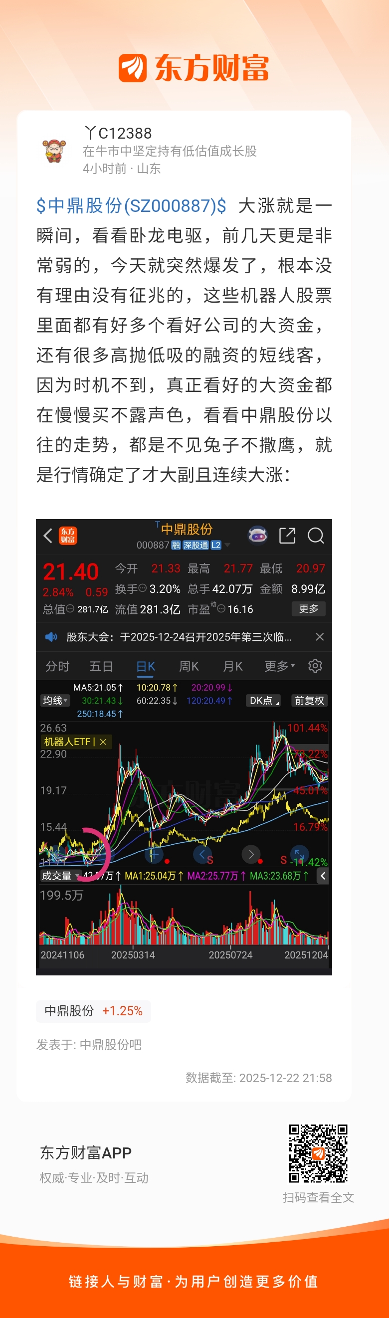 $中鼎股份(SZ000887)$ 大涨就是一瞬间,看看卧龙电驱,前几天更是非常弱的,今天就突然爆发了,根本没有理由没有征兆的,这些机器人股票里面都有好多个看好公司的大资金,还有很多高抛低吸的融资的短线客,因为时机不到,真正看好的大资金都在慢慢买不露声色,看看中鼎股份以往的走势,都是不见兔子不撒鹰,就是行情确定了才大副且连续大涨: