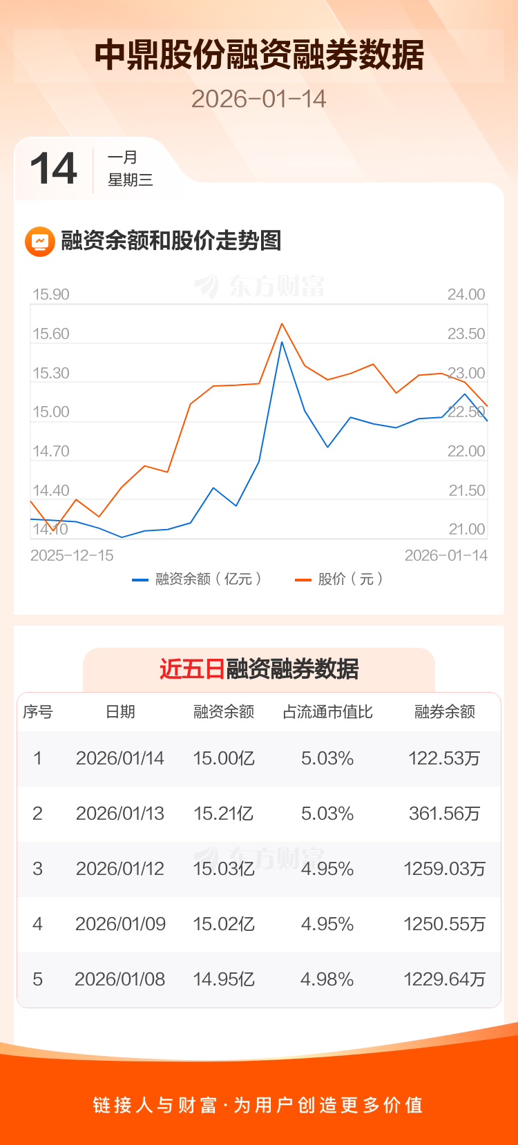 交易所最新数据显示,中鼎股份于2026年1月14日获融资买入2.03亿元,融资偿还2.24亿元,当日融资净偿还2069.23万元。目前,该股融资余额15.00亿,占流通市值比例为5.03%。
