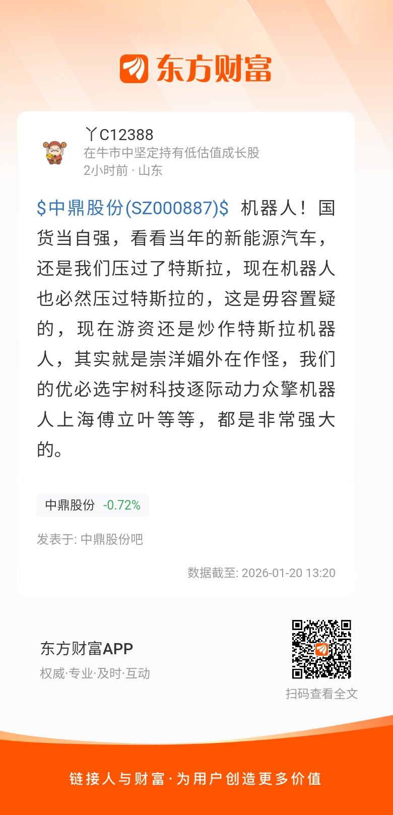 温馨提示: 1.根据《证券法》规定,禁止编造、传播虚假信息或者误导性信息,扰乱证券市场;2.用户在本社区发表的所有资料、言论等仅代表个人观点,与本网站立场无关,不对您构成任何投资建议。用户应基于自己的独立判断,自行决定证券投资并承担相应风险。《东方财富社区管理规定》