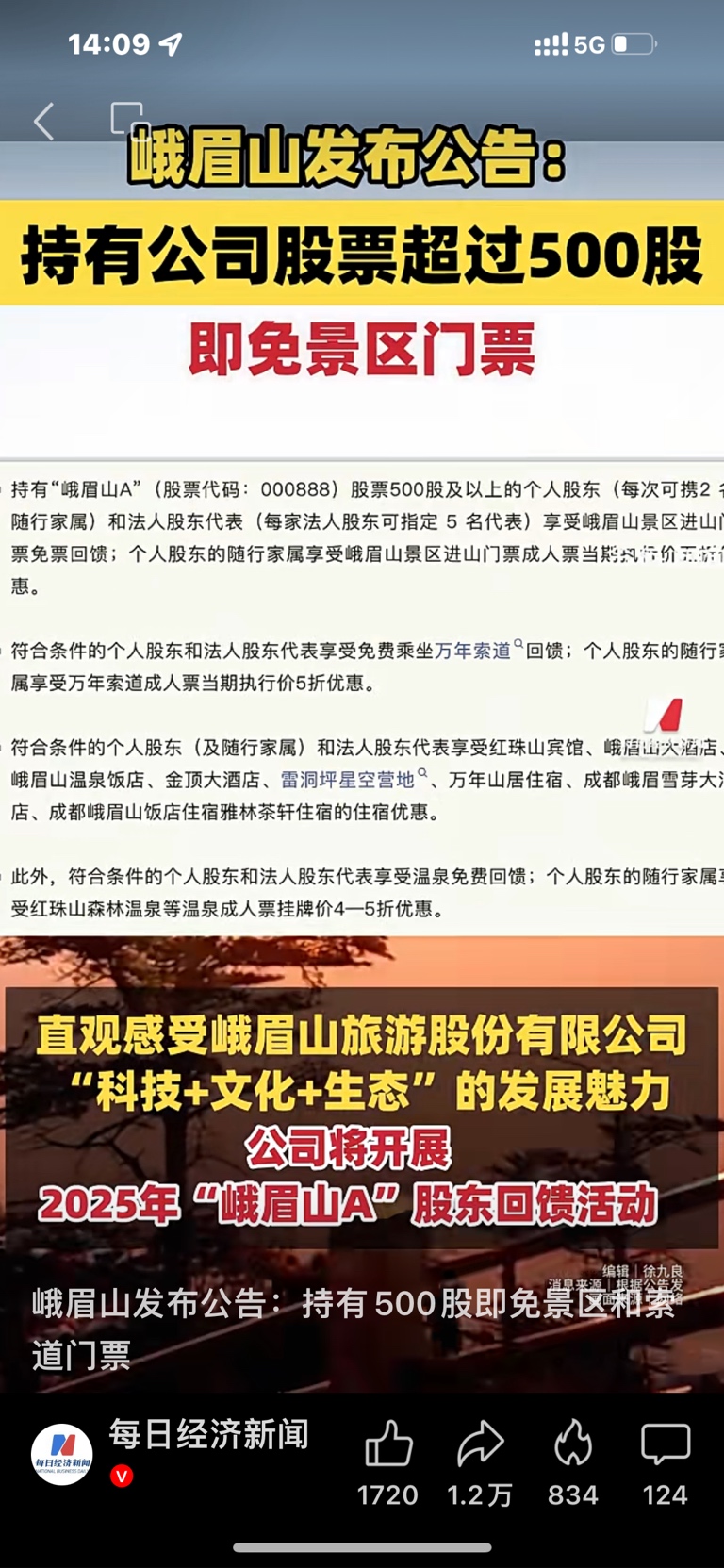 峨眉山A给这些股东发福利:景区多个项目免费,随行家属也有折扣优惠。