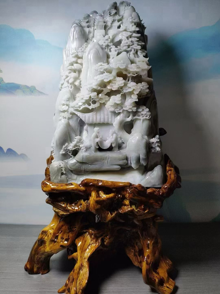 $峨眉山A(SZ000888)$ 和田玉青海料 (高山流水觅知音)摆件 玉质细腻纯净,过灯通透无杂,通身油亮四溢,纯手工立体精雕 层次分明,美轮美奂,档次十足!净尺寸360/230/90mm带座高560mm重量20斤。