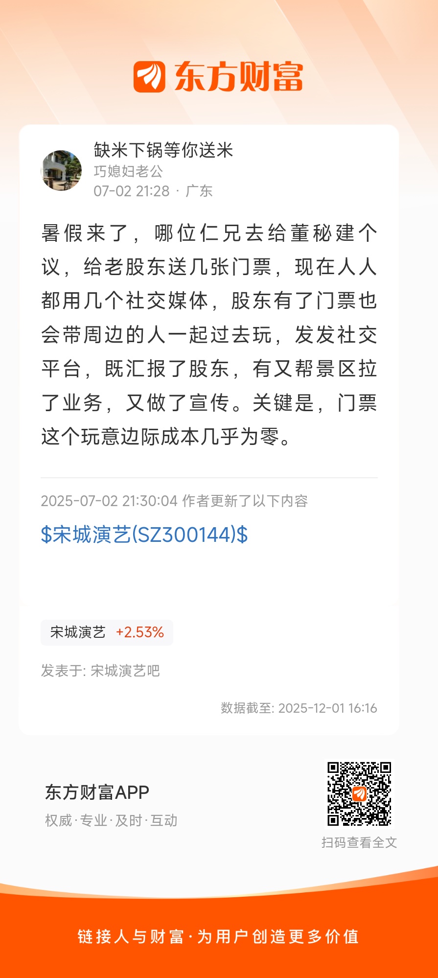 暑假来了,哪位仁兄去给董秘建个议,给老股东送几张门票,现在人人都用几个社交媒体,股东有了门票也会带周边的人一起过去玩,发发社交平台,既汇报了股东,有又帮景区拉了业务,又做了宣传。关键是,门票这个玩意边际成本几乎为零。