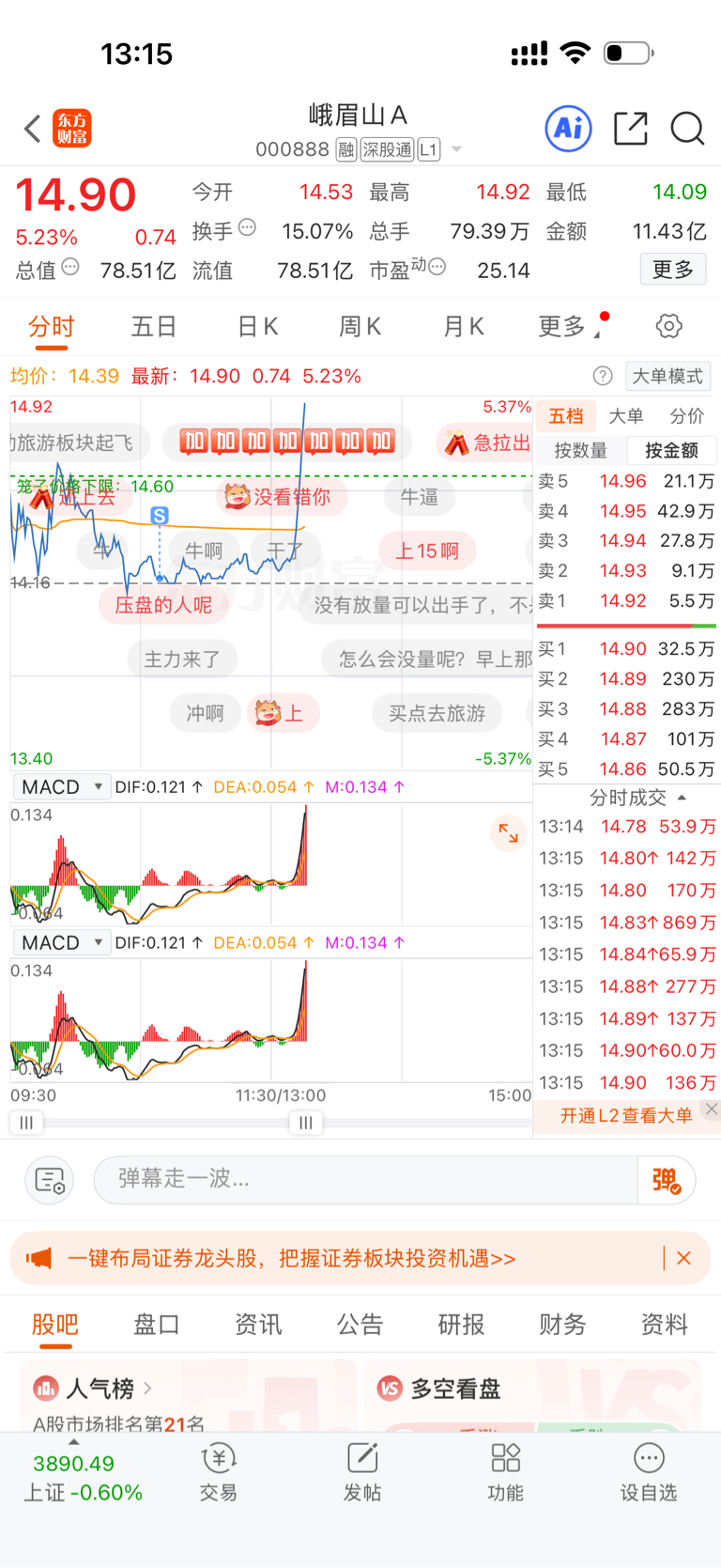 $峨眉山A(SZ000888)$ 早上走下午张停