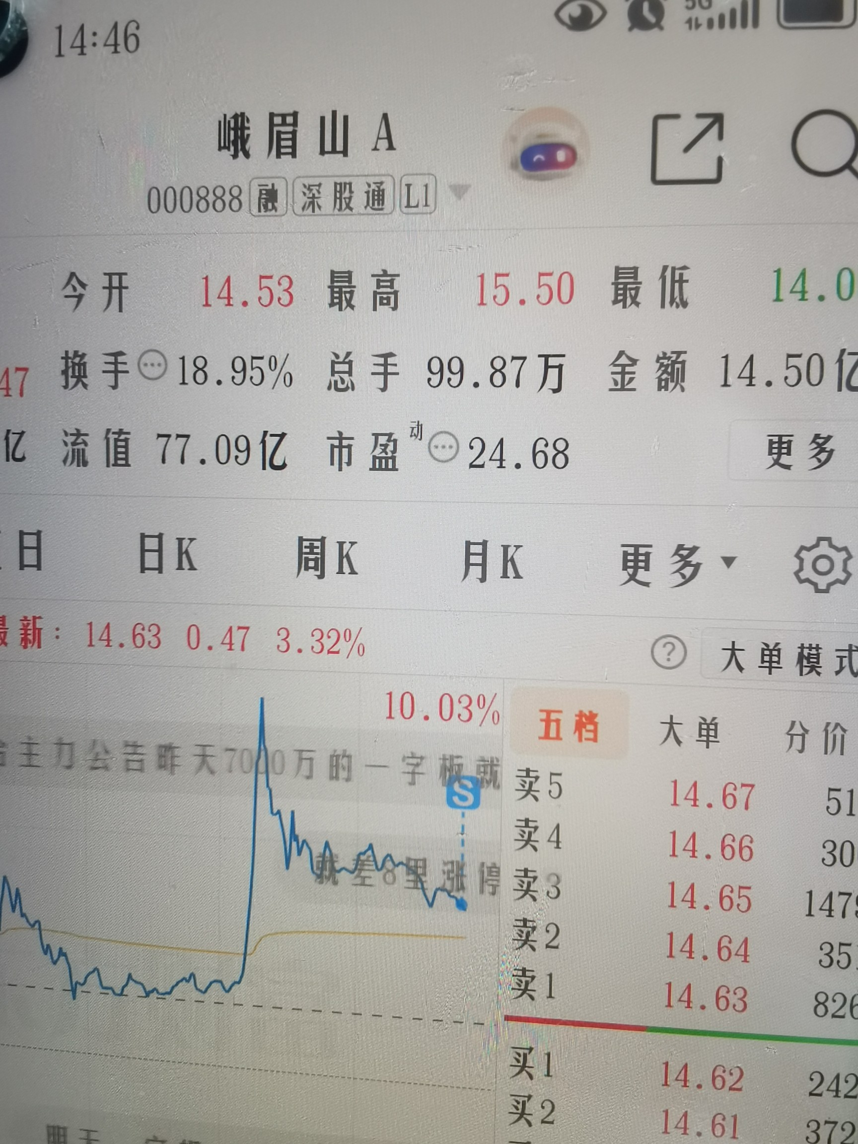$峨眉山A(SZ000888)$ 费这么大劲连个两板都没走出来,赚3个多点,大失所望,格局到最后了,走了。
