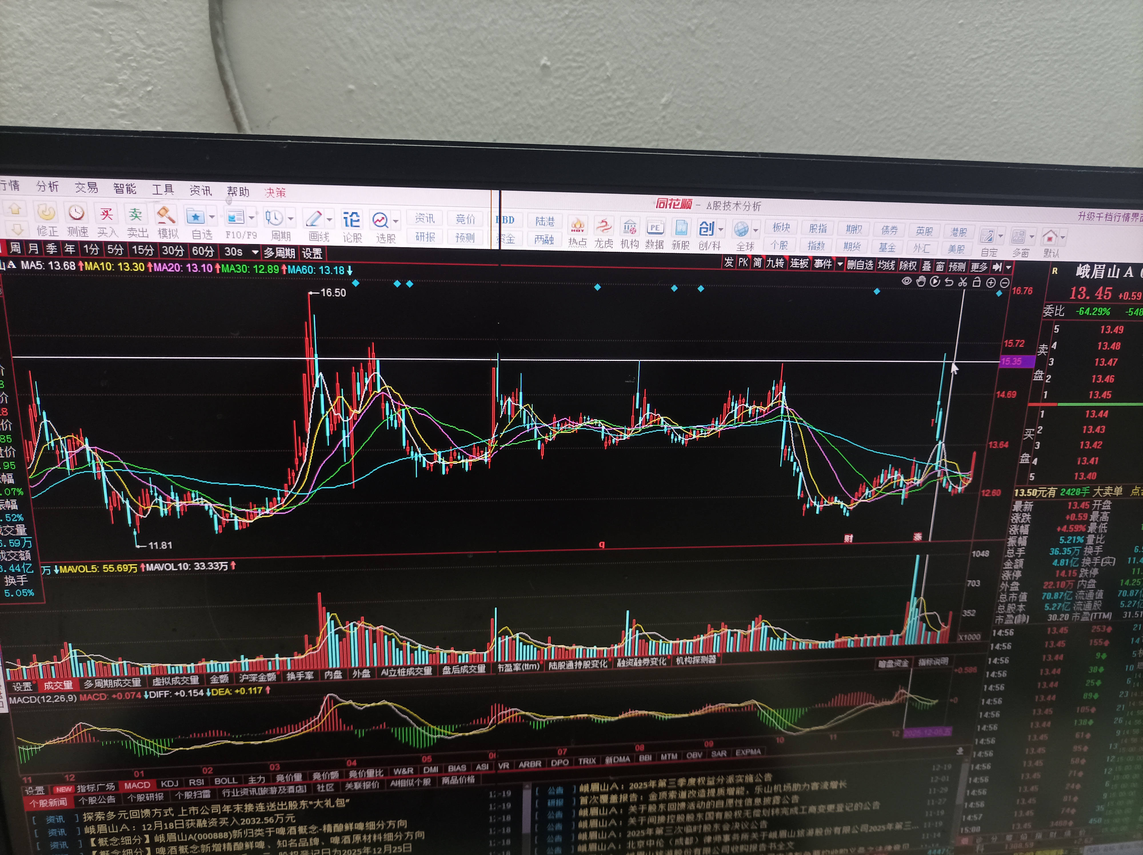 按日K线来看,峨眉山太美了,这是标准的洗盘,同一个价位反复拉扯洗盘。