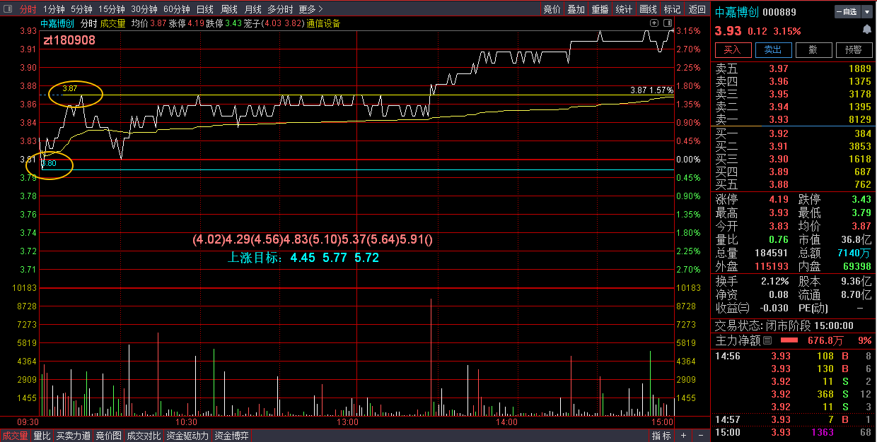 上图是今天的分时,我标注了两根标价线,标价线取10点前的可见高点3.87元和10点前的可见低点3.80元,以3.87-3.80=0.07,那么当股价高于3.87元之后向上最重要的重点为:3.87 0.07=3.94元。