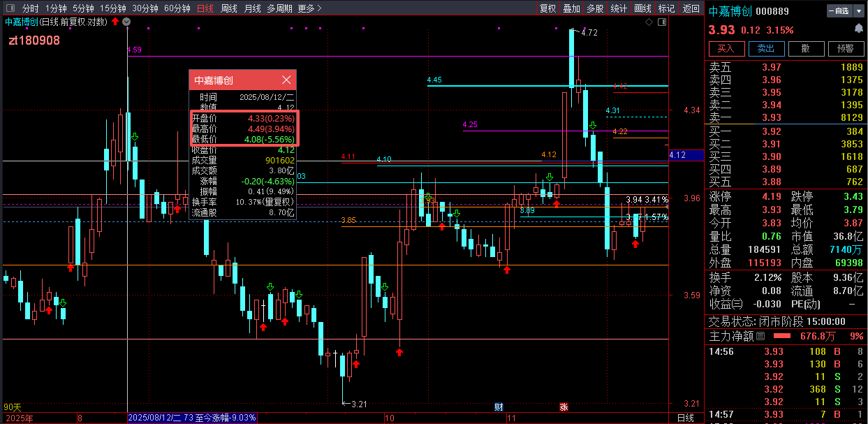 上图我所标注的标价线,都是主力固定操盘点,会变数值的我不会标注在K线图上。8月12日就可以计算出未来当第一次上涨到4.59元需要注意上多下空,计算方法[(4.49 4.08)/2 4.33]/2*1.068=4.59元,相加除以2之后的数值不要四舍五入,想学习的自己算算