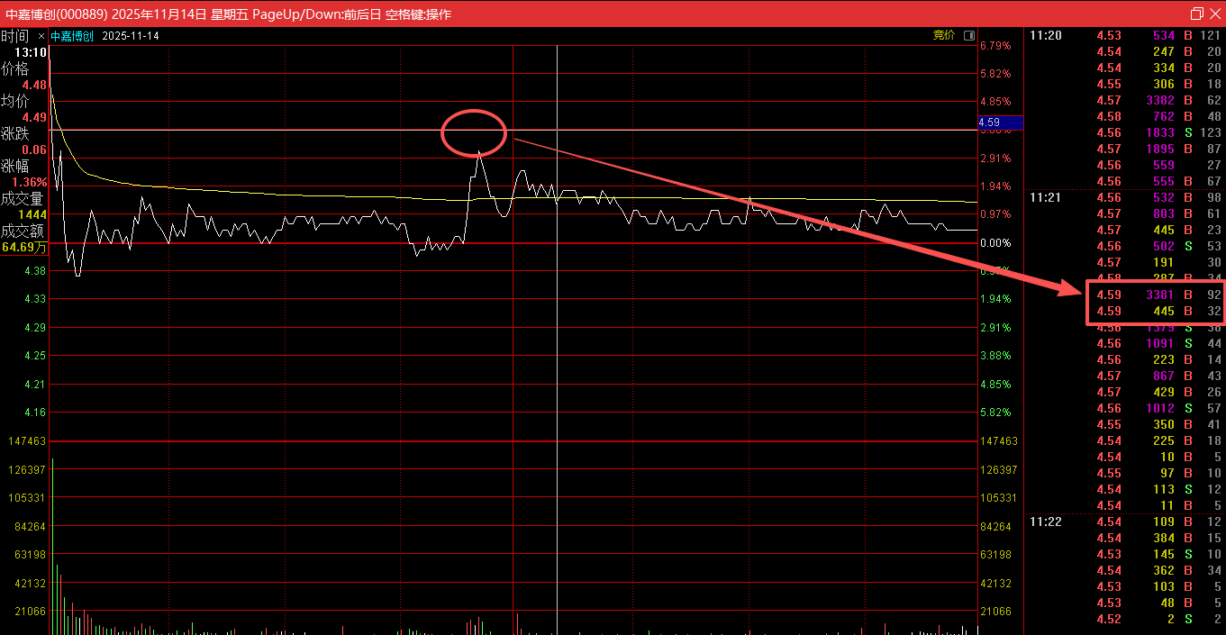 涨停之后第一次上摸4.59元之后,股价在之下盘中急拉就是做的这个高,这是当天做开盘价高于之后的低于再向上,属于二次向上,精确到分的最高点,上不去必跌