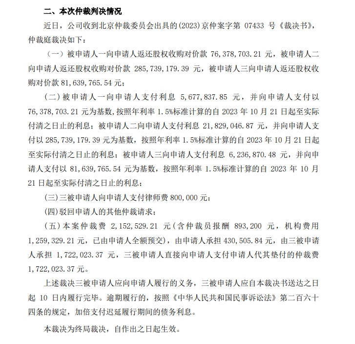 什么意思啊,就是当时12.4亿收购的中天嘉华,现在只能收回五亿多了吗?仲裁总计回