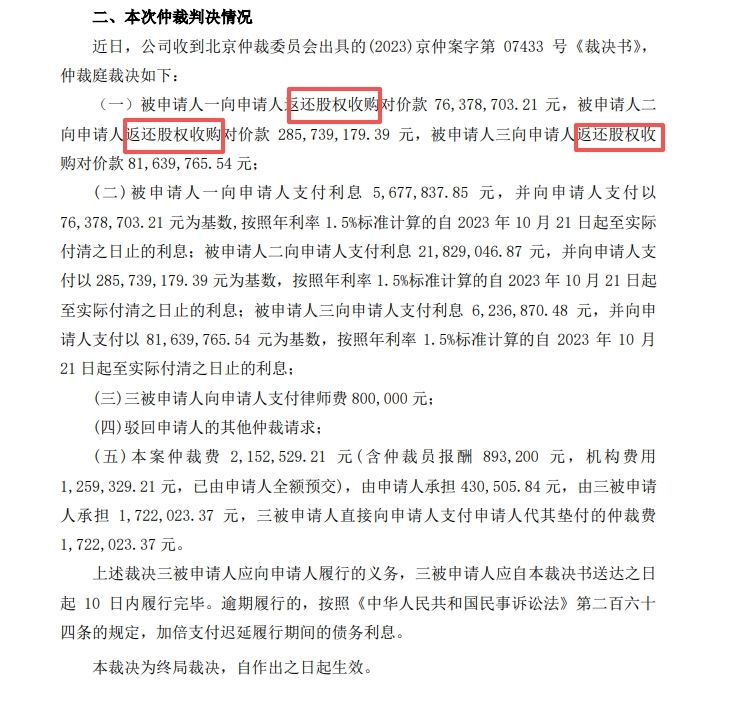 根据(2023)京仲案字第07433号《裁决书》,当时12.4亿收购的中天嘉华,