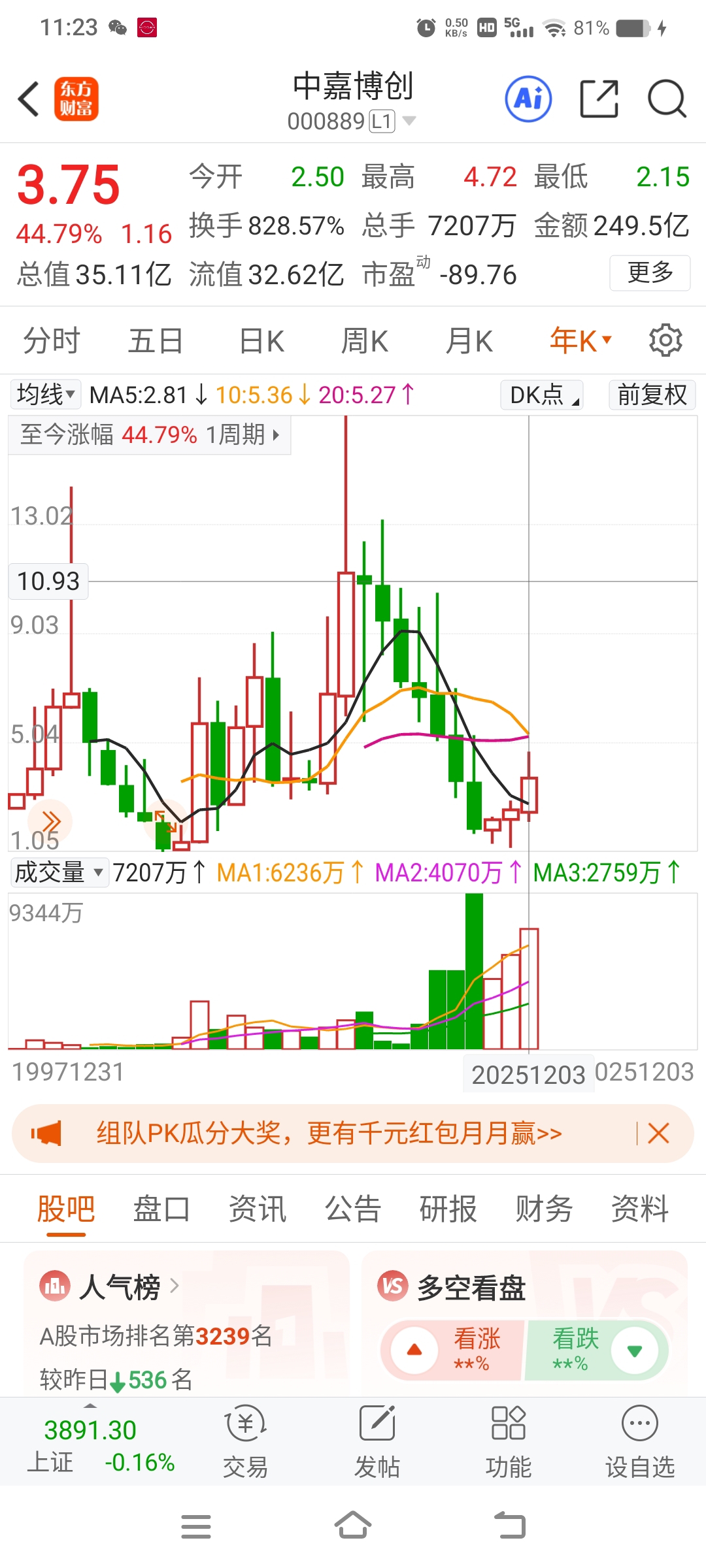$中嘉博创(SZ000889)$ 跌不死你