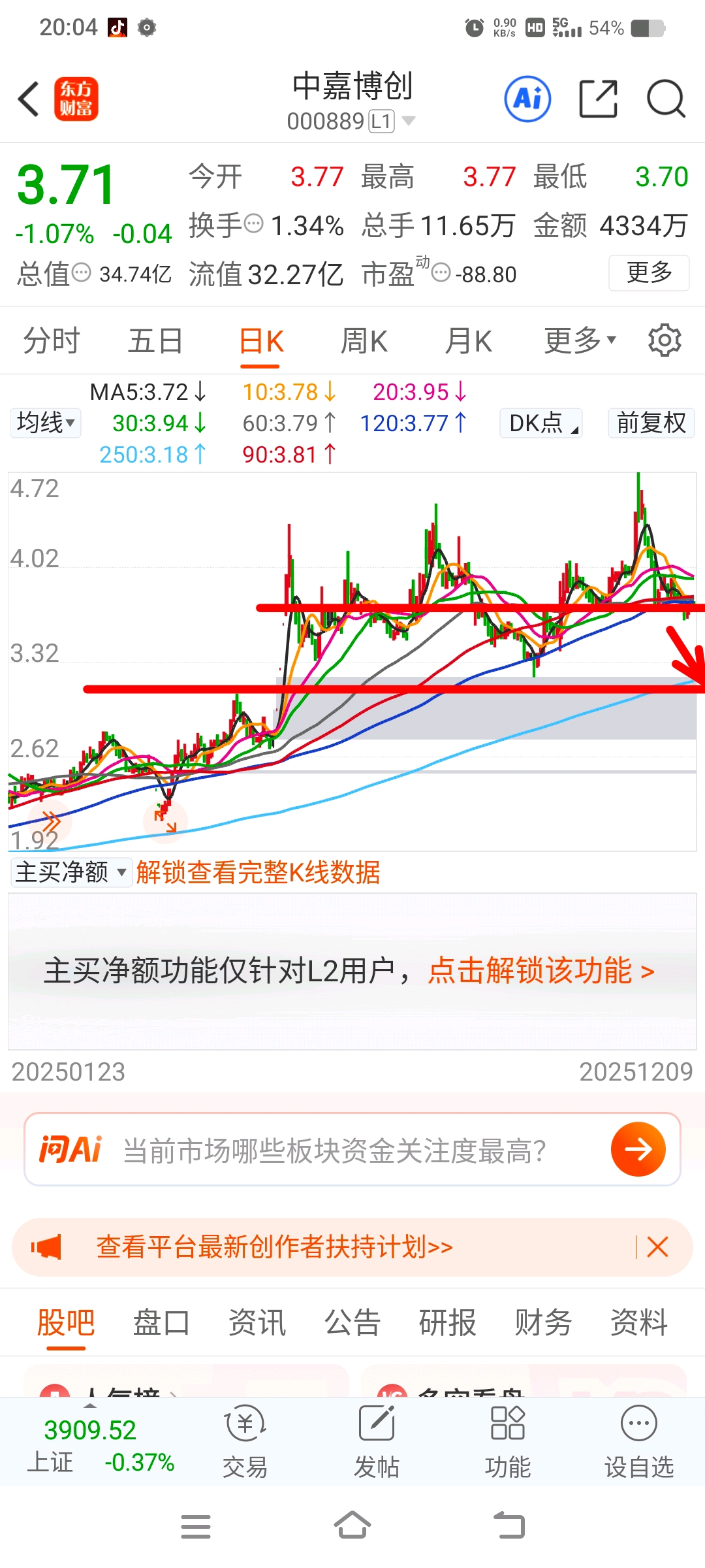 $中嘉博创(SZ000889)$ 6月6号到今日基本上属于横盘半年,上下幅度有点大,就我们团队研究表明,中嘉博创阴跌至3.14/股,今日收盘3.71/股,也就是还要下跌0.57/股!下方缺口多多少少要补一些,不然不会引起恐慌抛盘,不喜勿喷,欢迎拉黑。