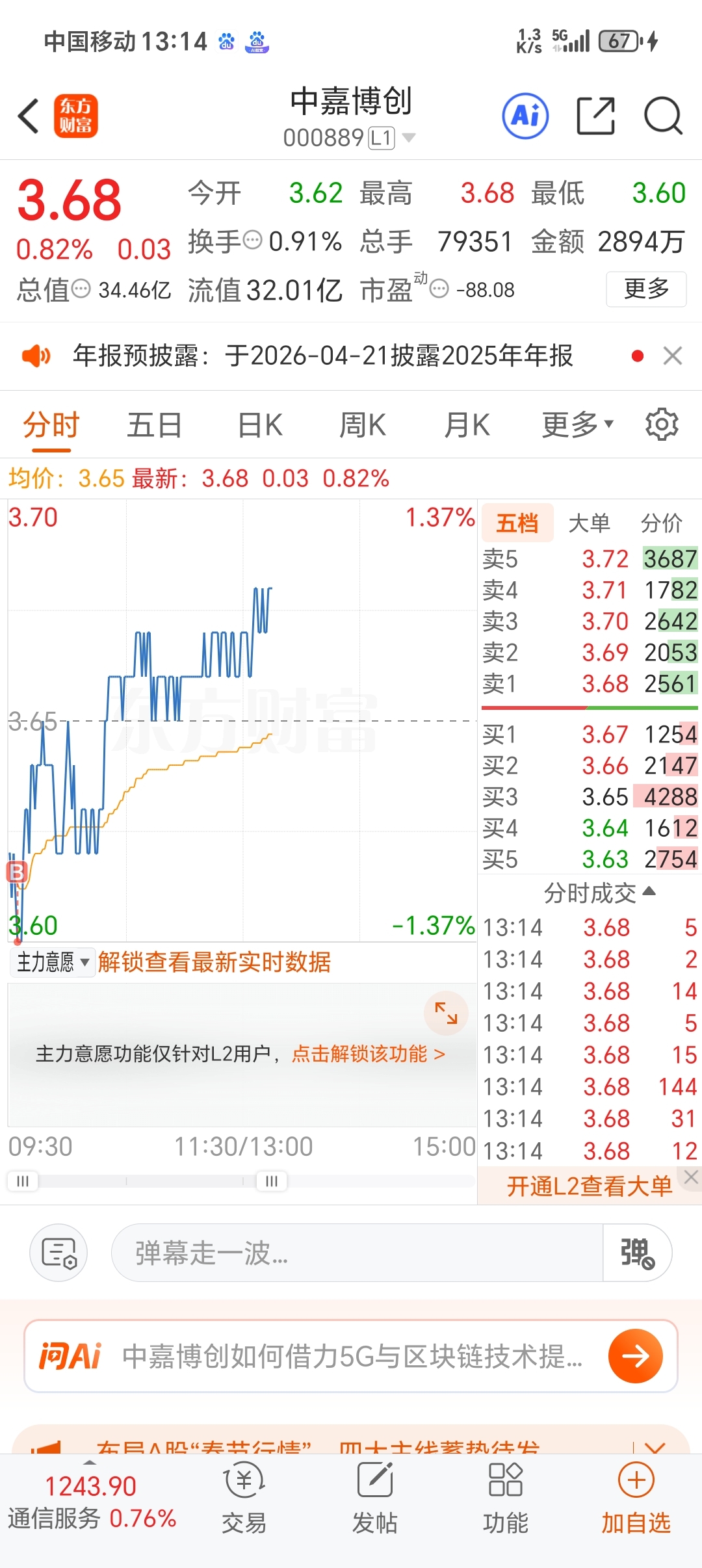 $中嘉博创(SZ000889)$ 赚了59块