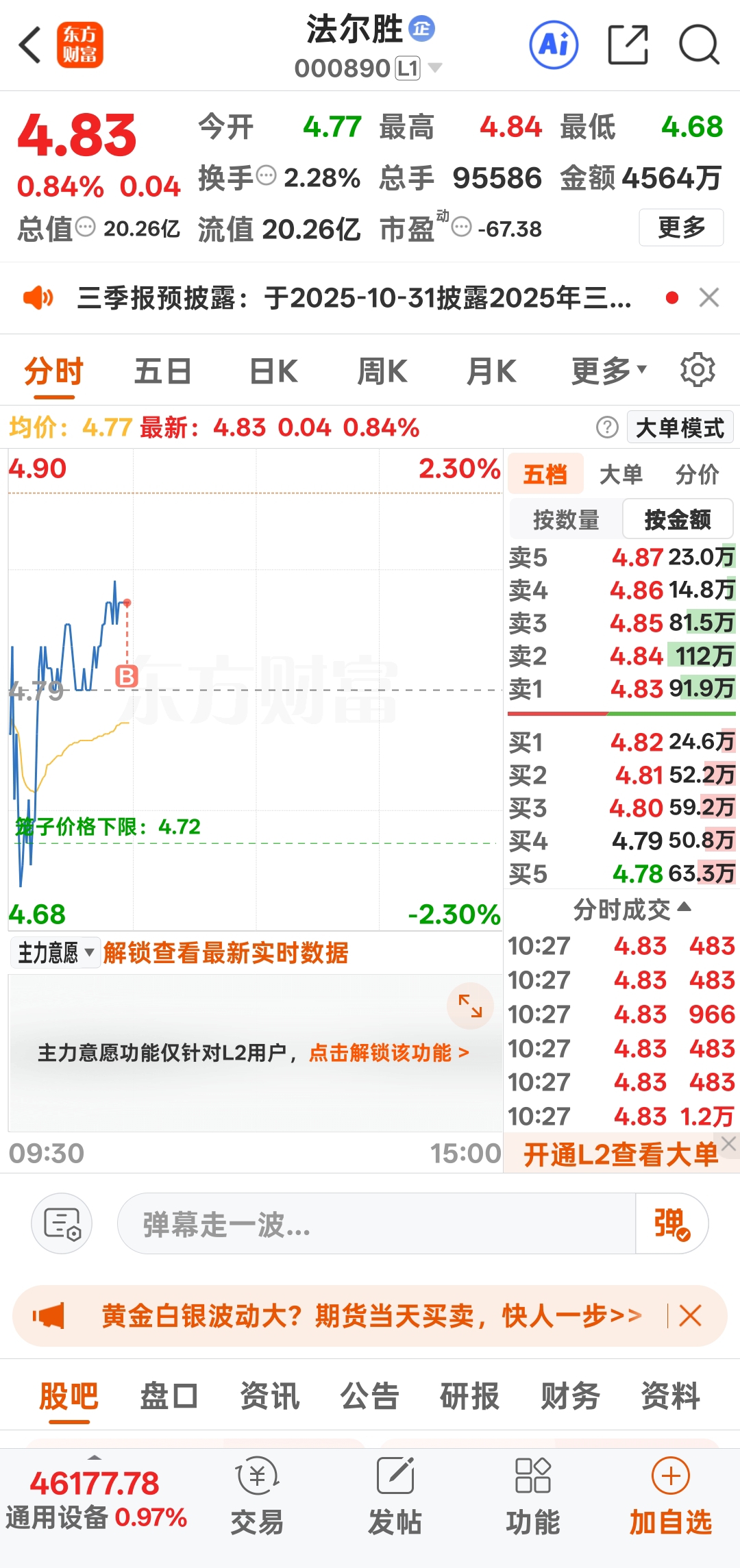 $法尔胜(SZ000890)$ 低价股有时候真的折磨人,几分钱能玩一天,按照本级别节点看,分时不破新低的话还有机会到4.97,强势到5.05/5.09可能,低概率反包冲击5.5