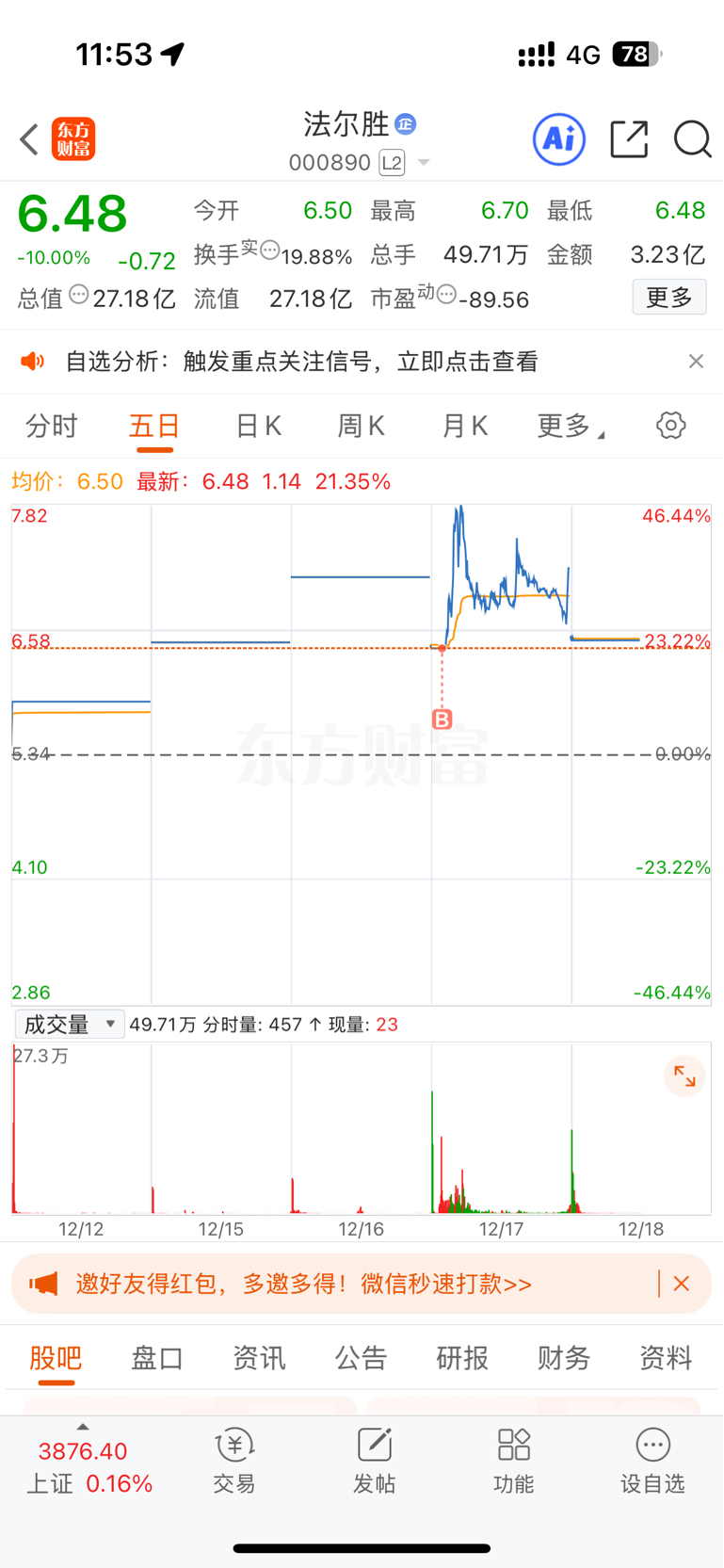 $法尔胜(SZ000890)$ 昨天接近地板重仓买了皮阿诺,剩下一点仓位买了你,本以为买了2个地天,开心极了,结果你不争气啊,我的皮阿诺稳得一批,你这点仓位放着