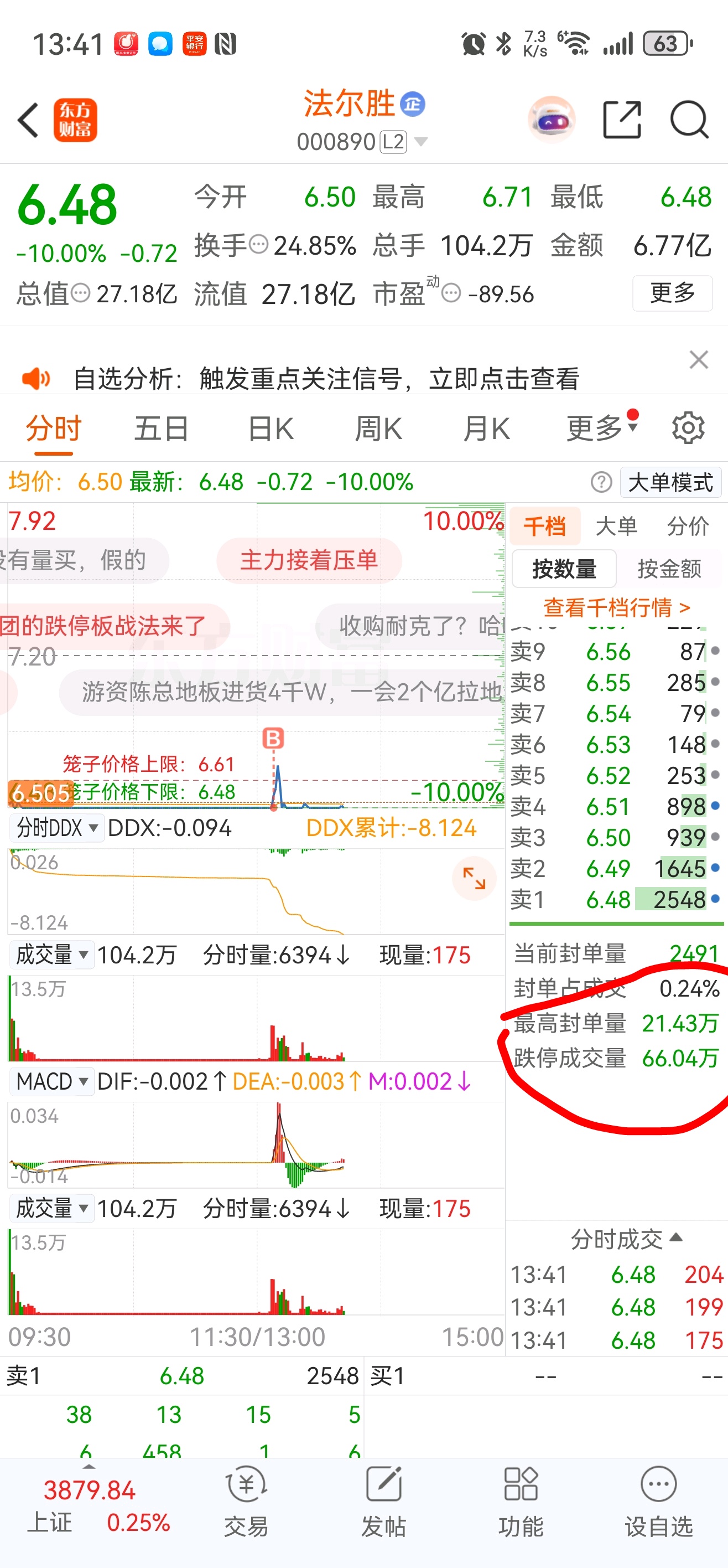 $法尔胜(SZ000890)$ 跌停成交了65万手