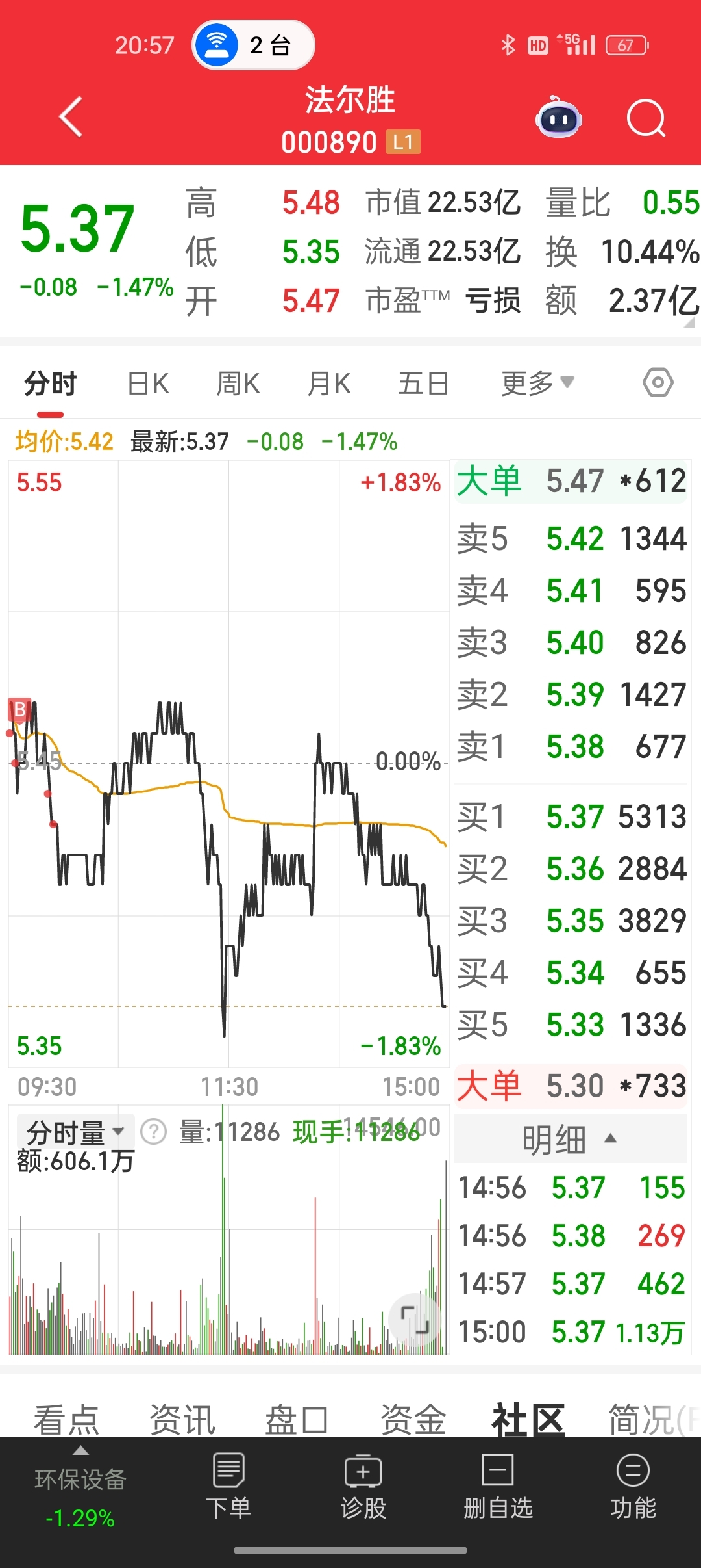 $法尔胜(SZ000890)$ 本来想得瑟一下,没想到收盘一看,居然挂在山顶啦,请大家点评一下。鄙人不才全仓买入杠杆拉满,成本5.449,今日基操已完成晒图如下