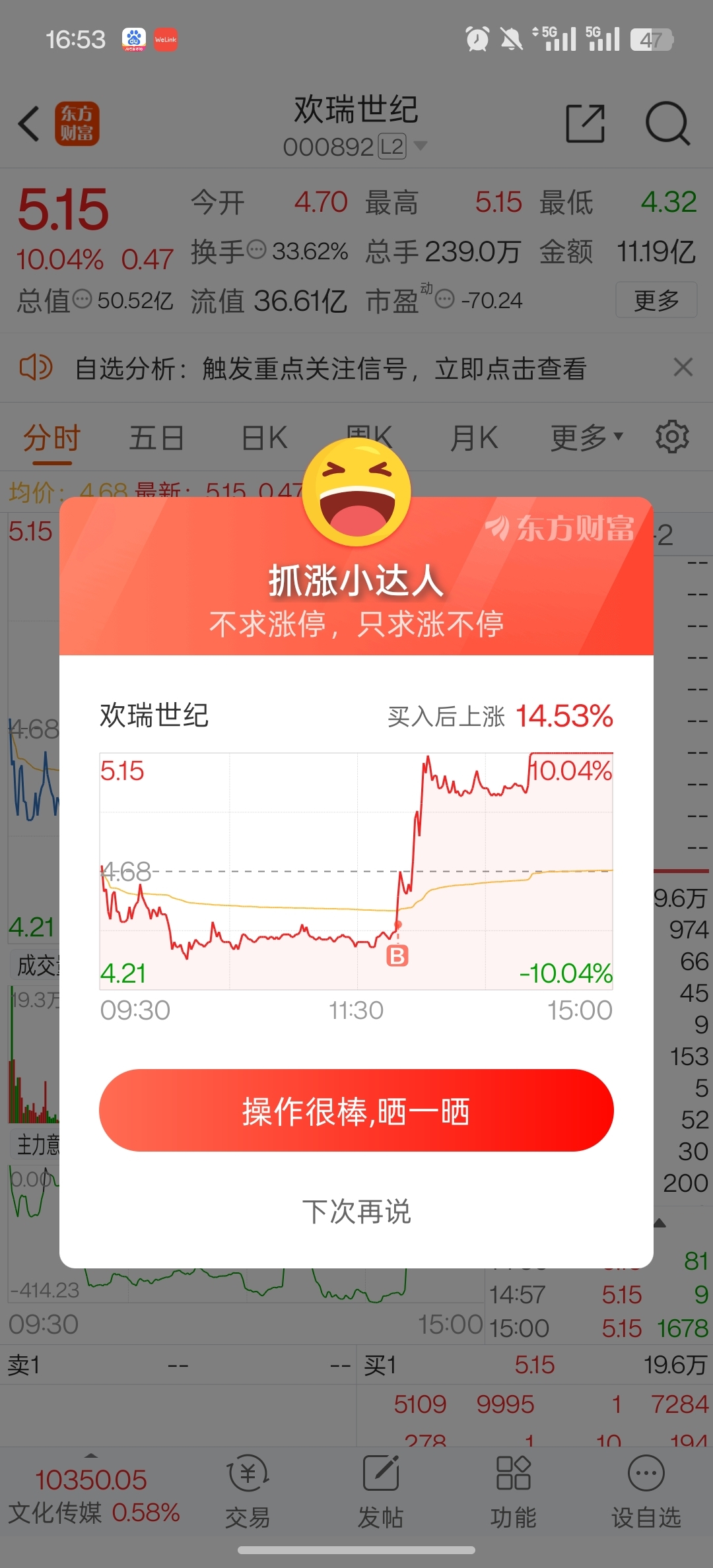 $欢瑞世纪(SZ000892)$ 还可以啊小欢,市场最高板了