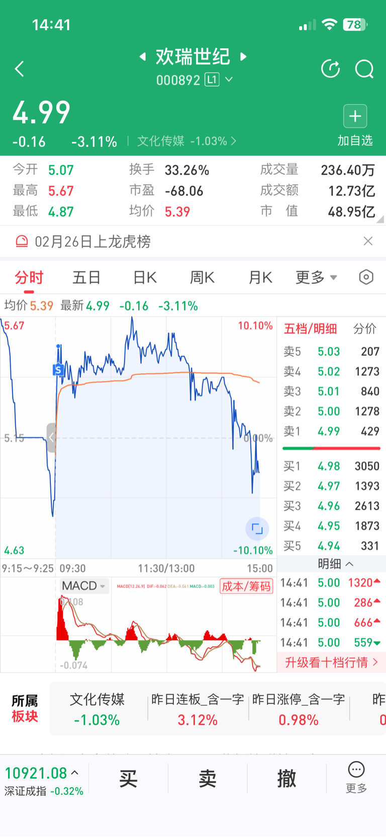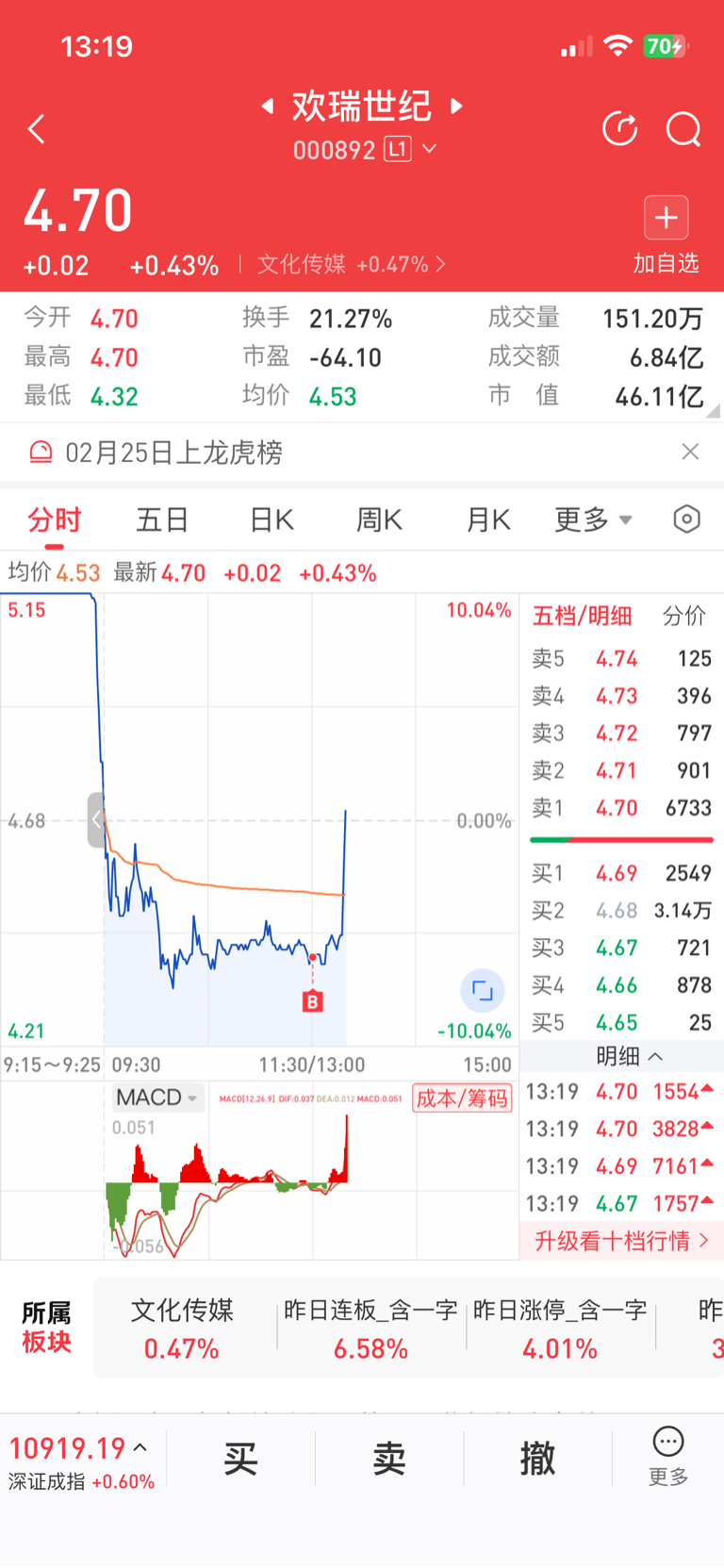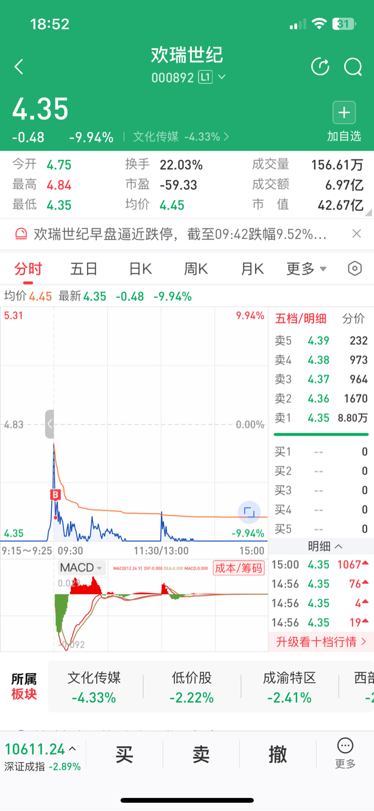 $欢瑞世纪(SZ000892)$ 今天4.45买的,虽然没挣到,但相比外面今天算少亏。这个票做T感觉不错