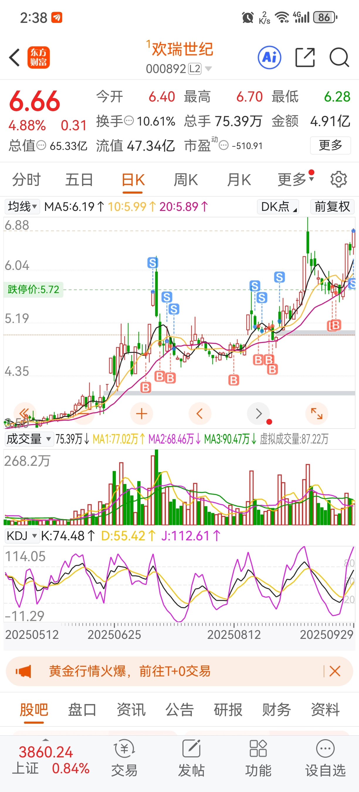 $欢瑞世纪(SZ000892)$ 号6.66我走半仓,