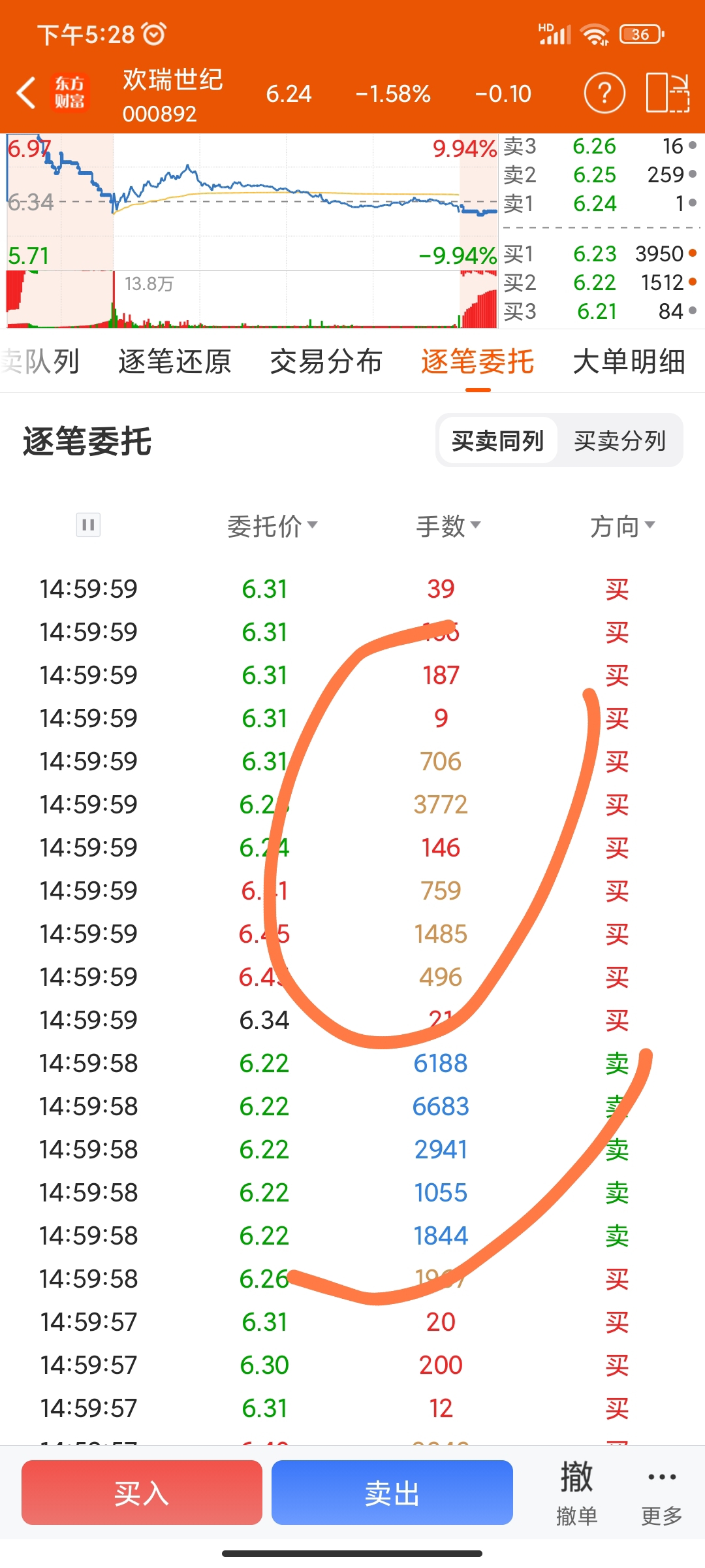 $欢瑞世纪(SZ000892)$ 尾盘竞价,量化资金拼命砸盘,一部分大户想拉高股价6.34