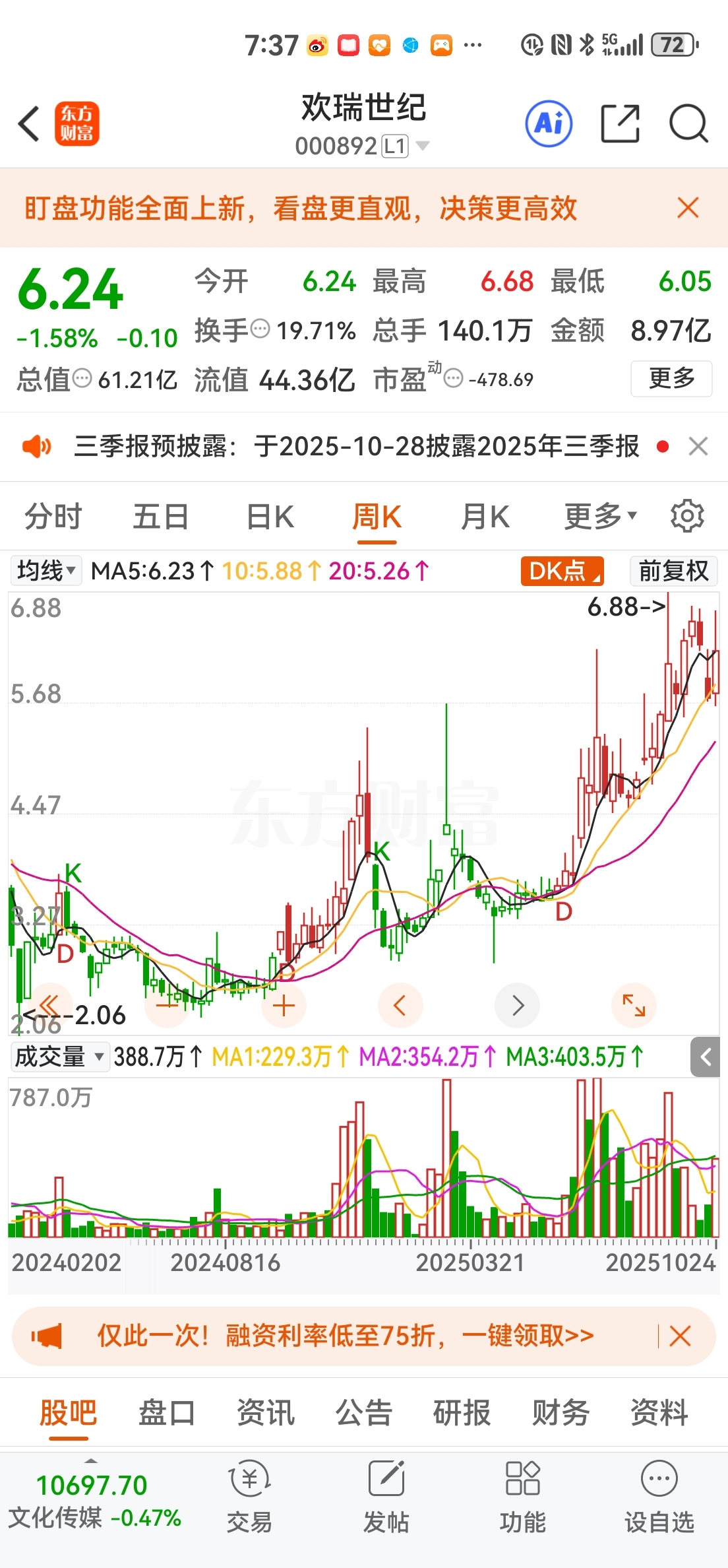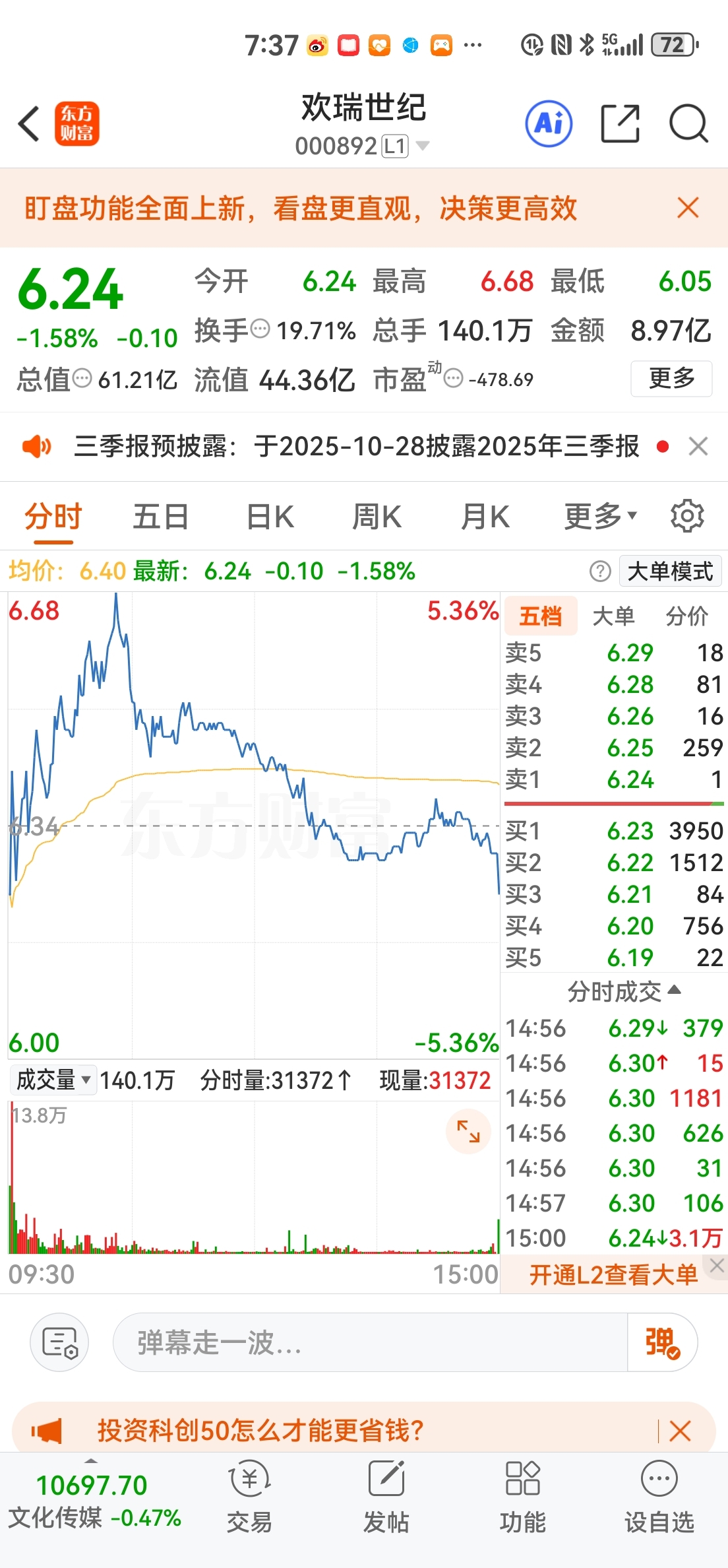 $欢瑞世纪(SZ000892)$ 欢瑞世纪。现在的巨震,就是逼青宥出局。欢瑞是:天下长安播出,10元肯定去。钟君艳的股权1元购(实质性执行业绩承诺补偿),10元肯定去。青宥的股权基本出清,10元可能去。否则 ,普通的利好利空,那只能是震荡,波段式震荡。分时震荡日线震荡周线震荡。
