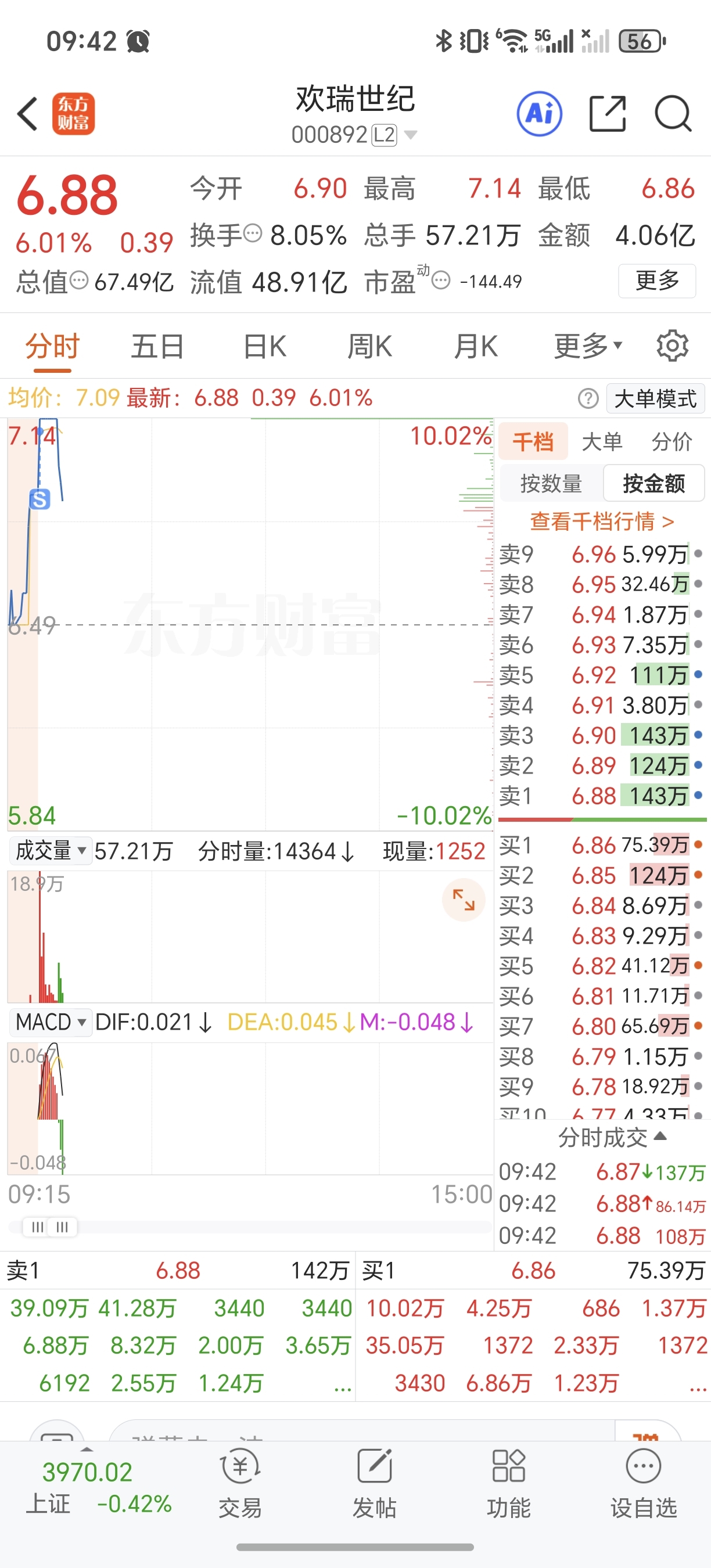 $欢瑞世纪(SZ000892)$ 一般情况我都会格局的,实在是这个主力烦人的很,每次都不好好拉