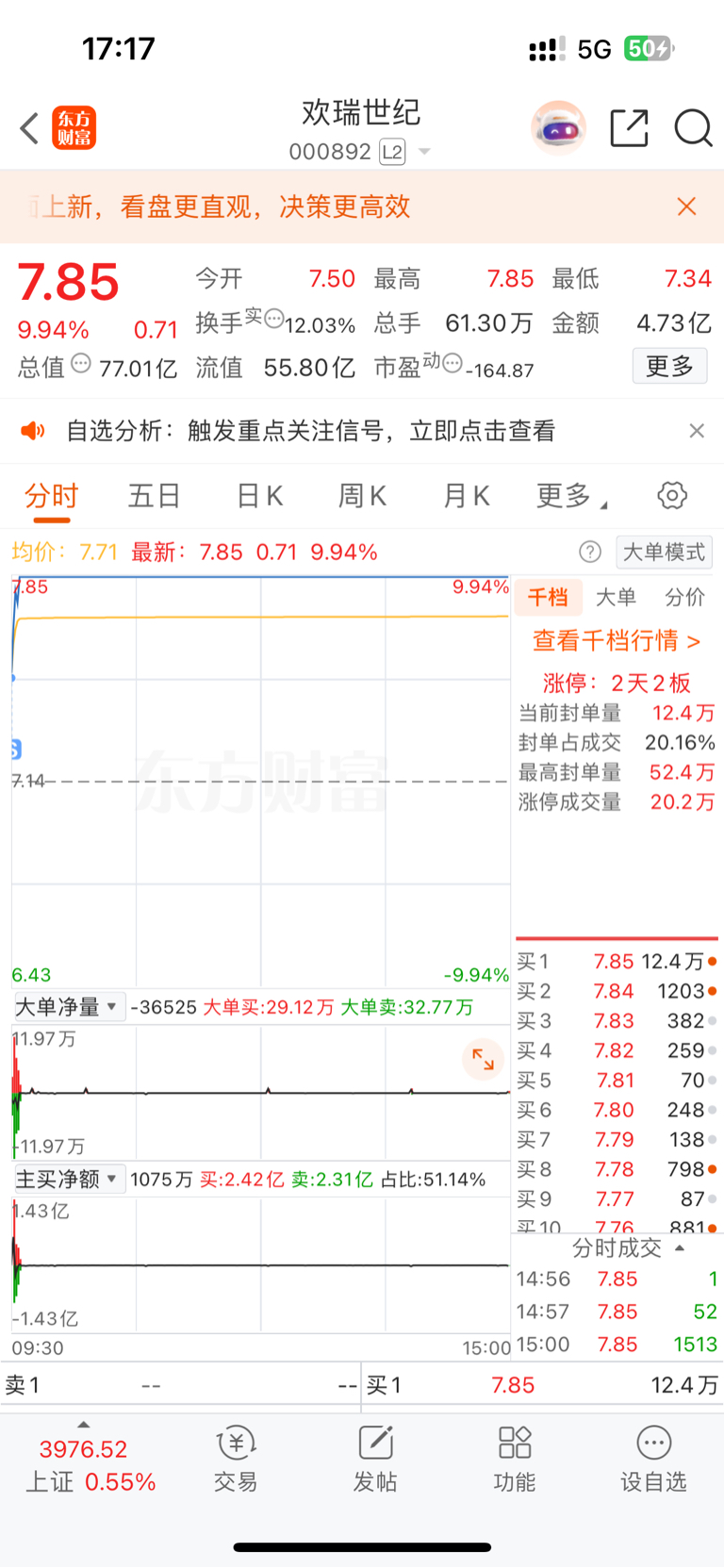 $欢瑞世纪(SZ000892)$ 一进二目送