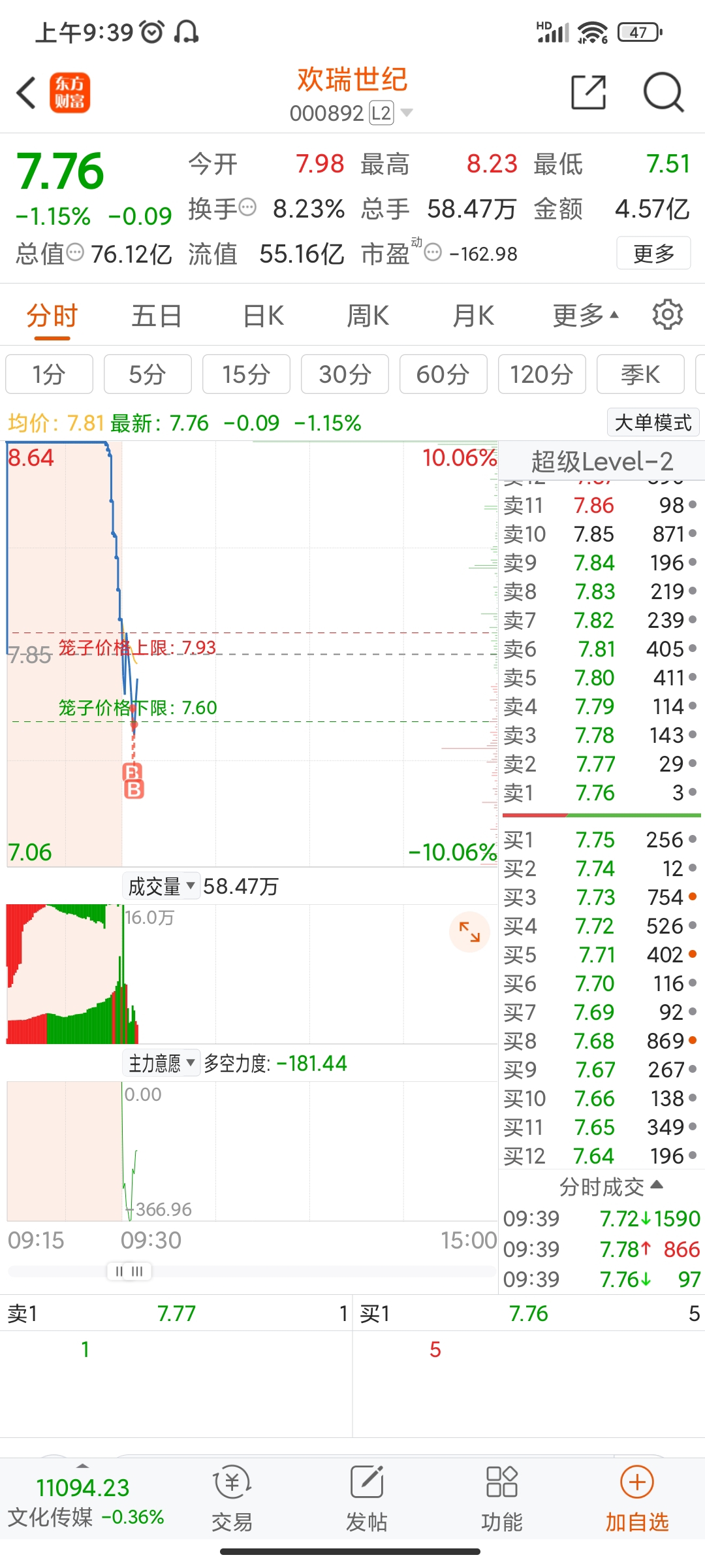 $欢瑞世纪(SZ000892)$ 怕什么,继续加仓干,接回来卖单