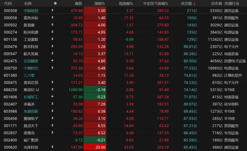 市场赚钱效应显著,共计4300只个股收涨,涨停股95只;993只个股收跌,跌停股5只。今日有5只个股日成交额超过100亿元,中际旭创收涨5%报479.66元/股,新易盛收涨4%;蓝色光标继续飘红,涨1.4%;阳光电源涨近5%,宁德时代微涨;胜宏科技、立讯精密、兆易创新涨势不错;多氟多今日大涨7.26%。