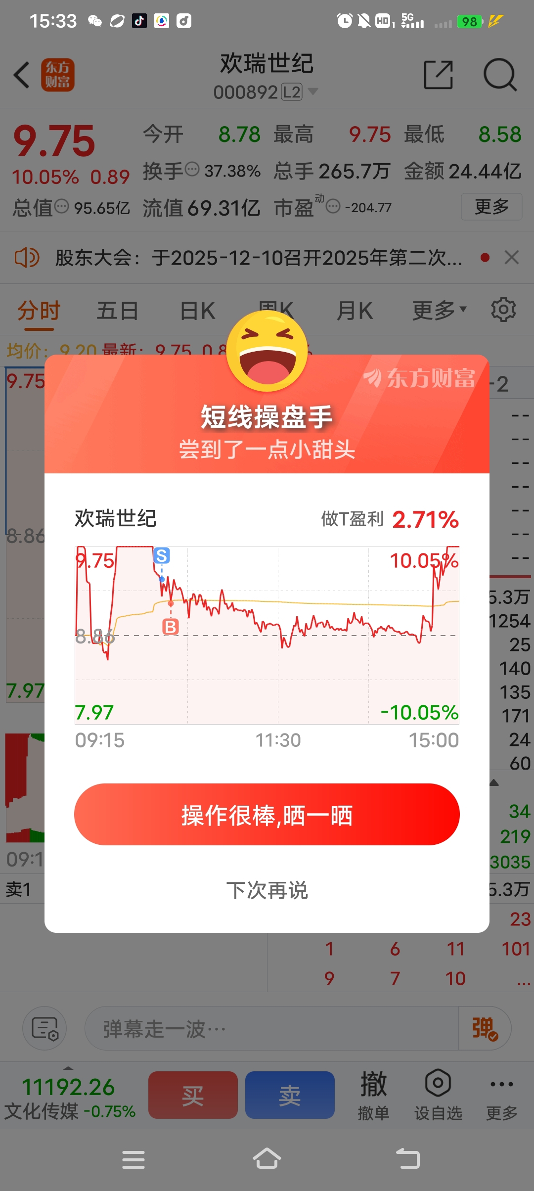 $欢瑞世纪(SZ000892)$ 今天又是心惊肉跳的一天