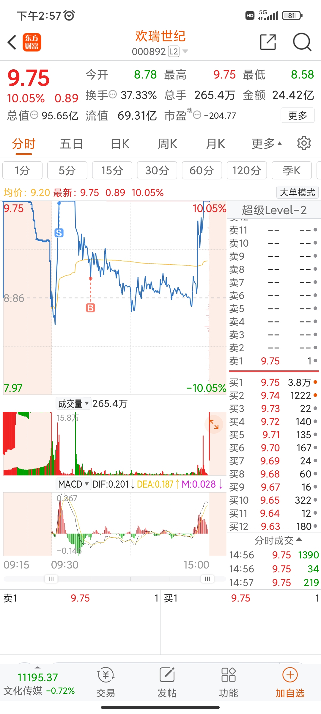今天操作堪称完美,对欢瑞没有坚定看好,是拿不住的