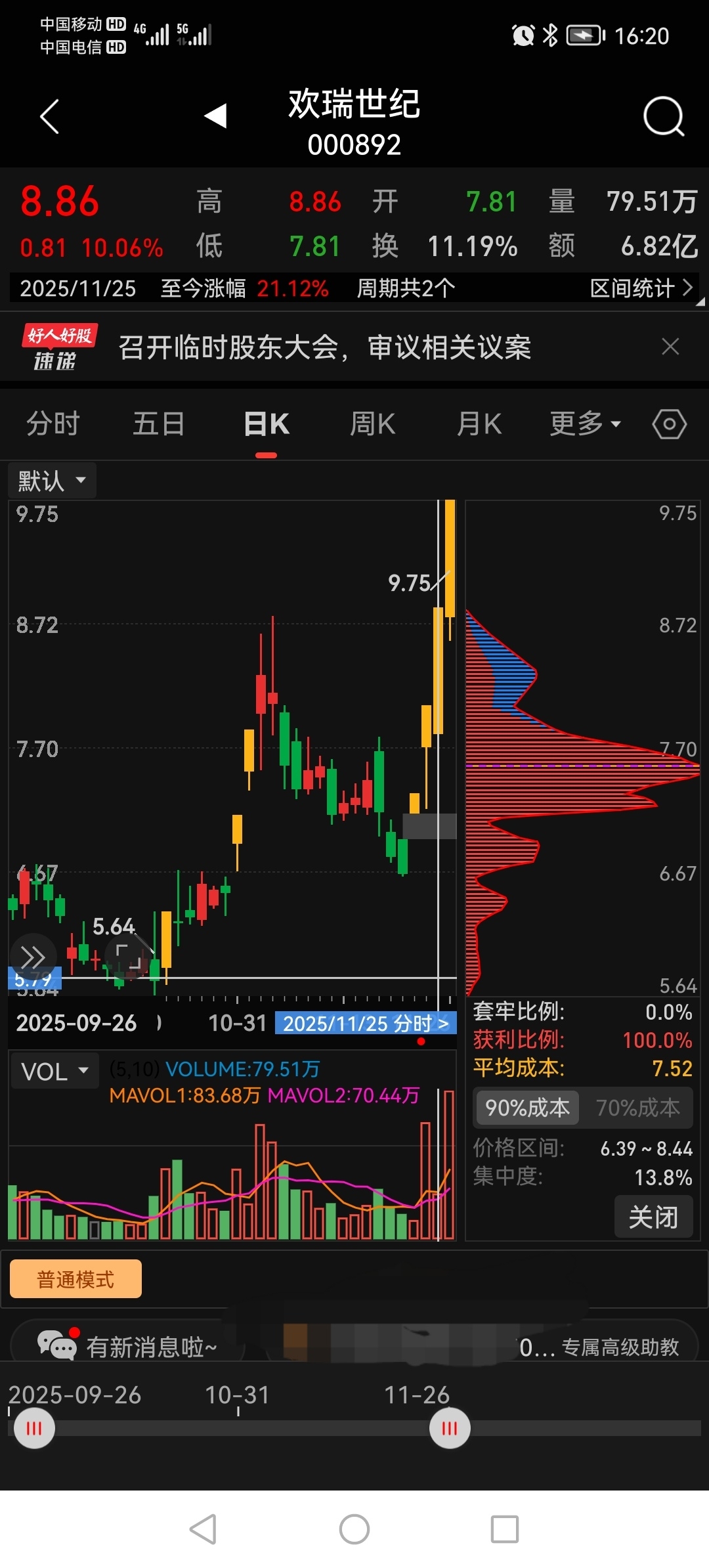 $欢瑞世纪(SZ000892)$ 二三板双线合一,不是龙就是虫,要么暴涨,要么暴跌这是变盘信号,今天买了一层试试水,如果首板前出现这个信号就大胆买入,可惜没有,