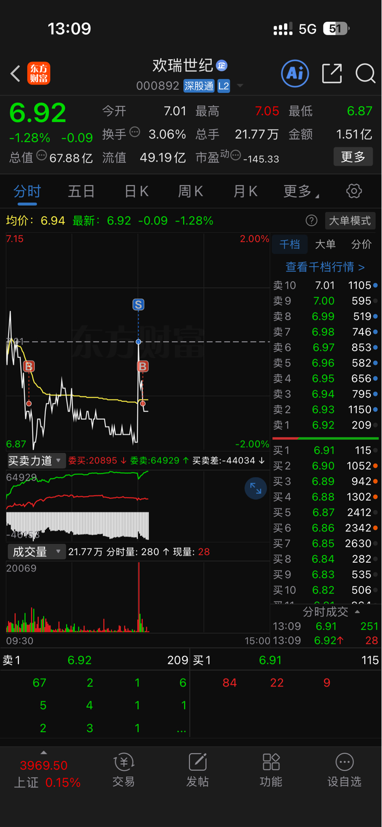 $欢瑞世纪(SZ000892)$ 这小子乌龙指玩的好